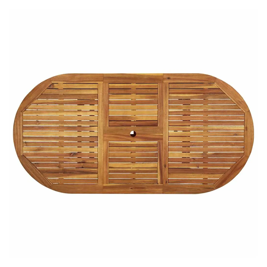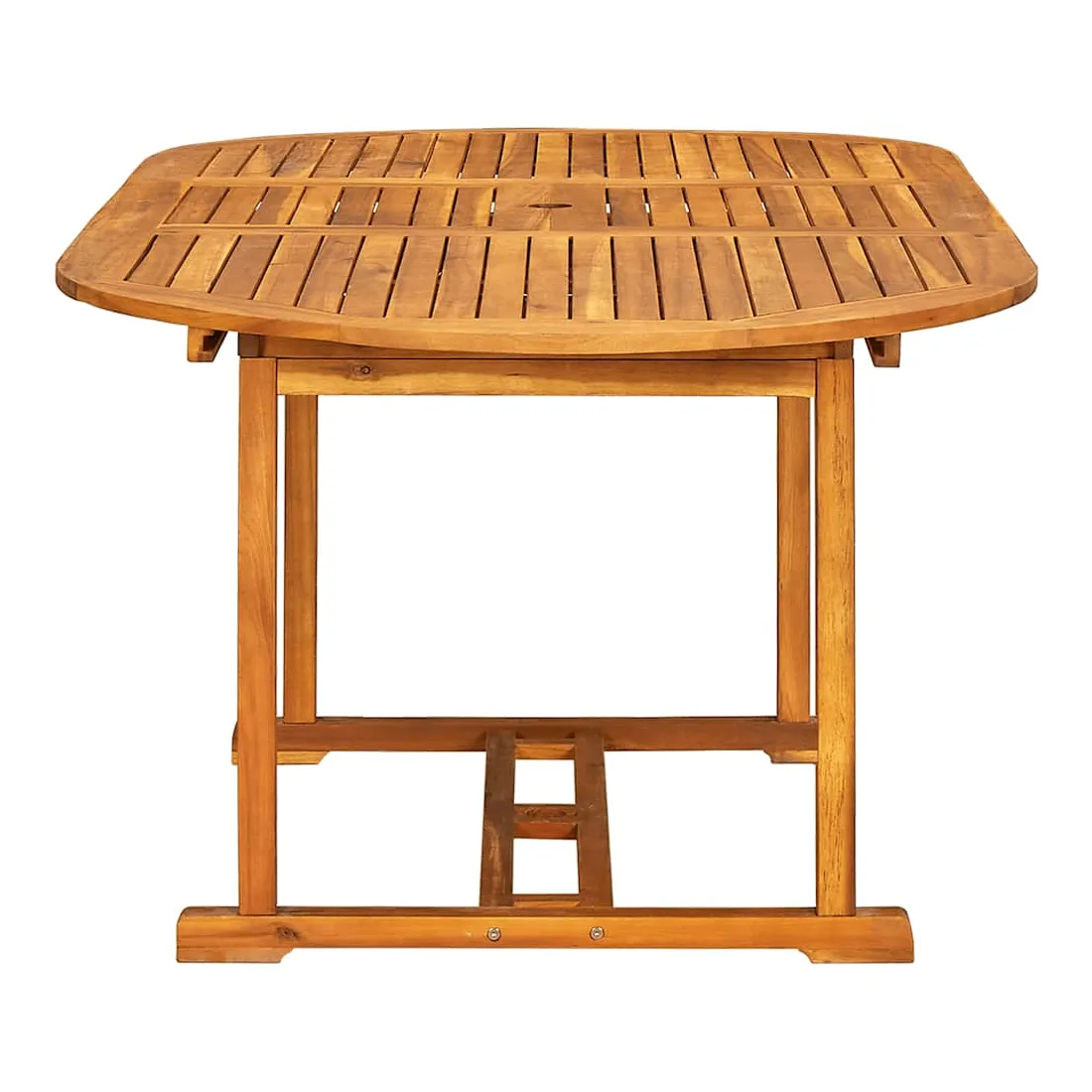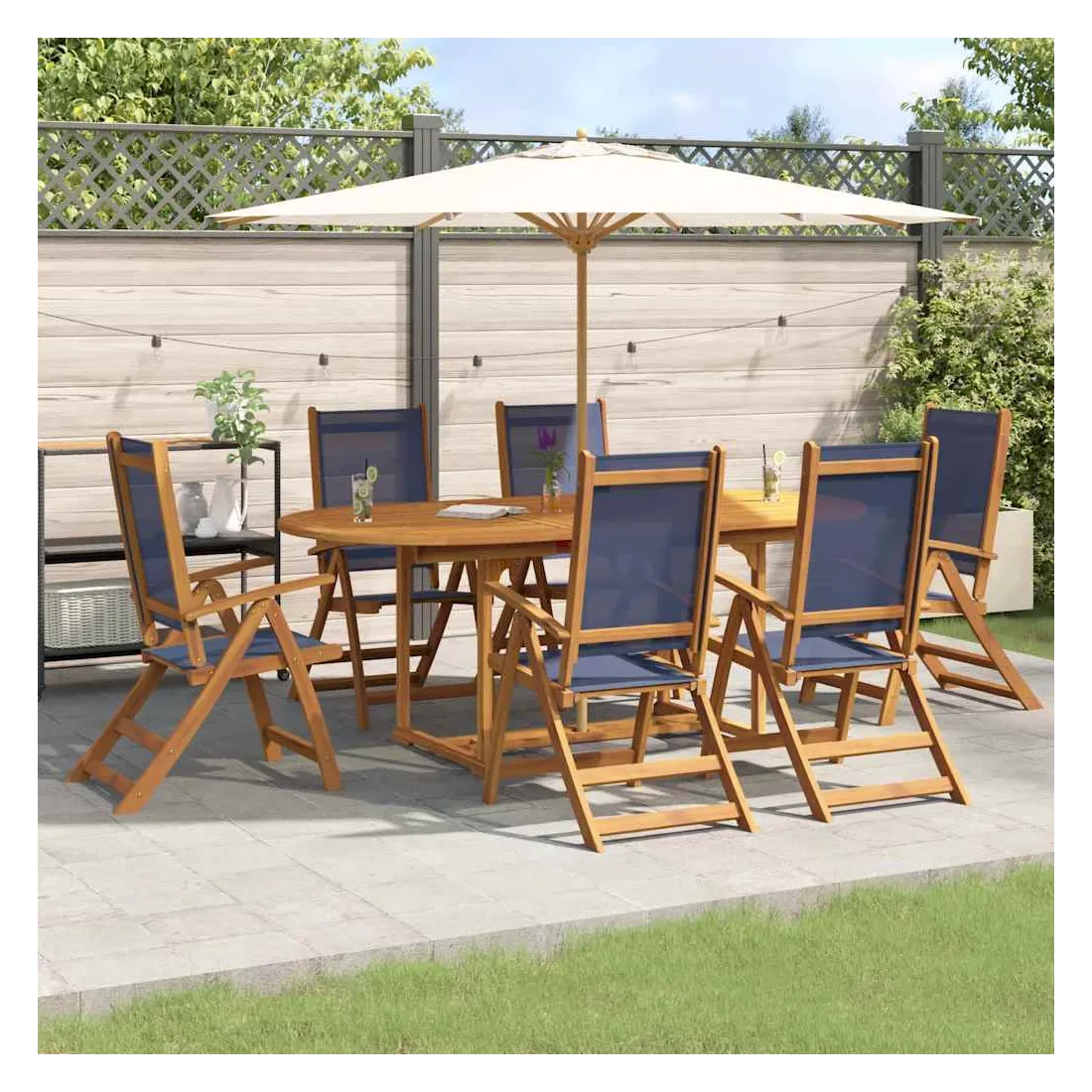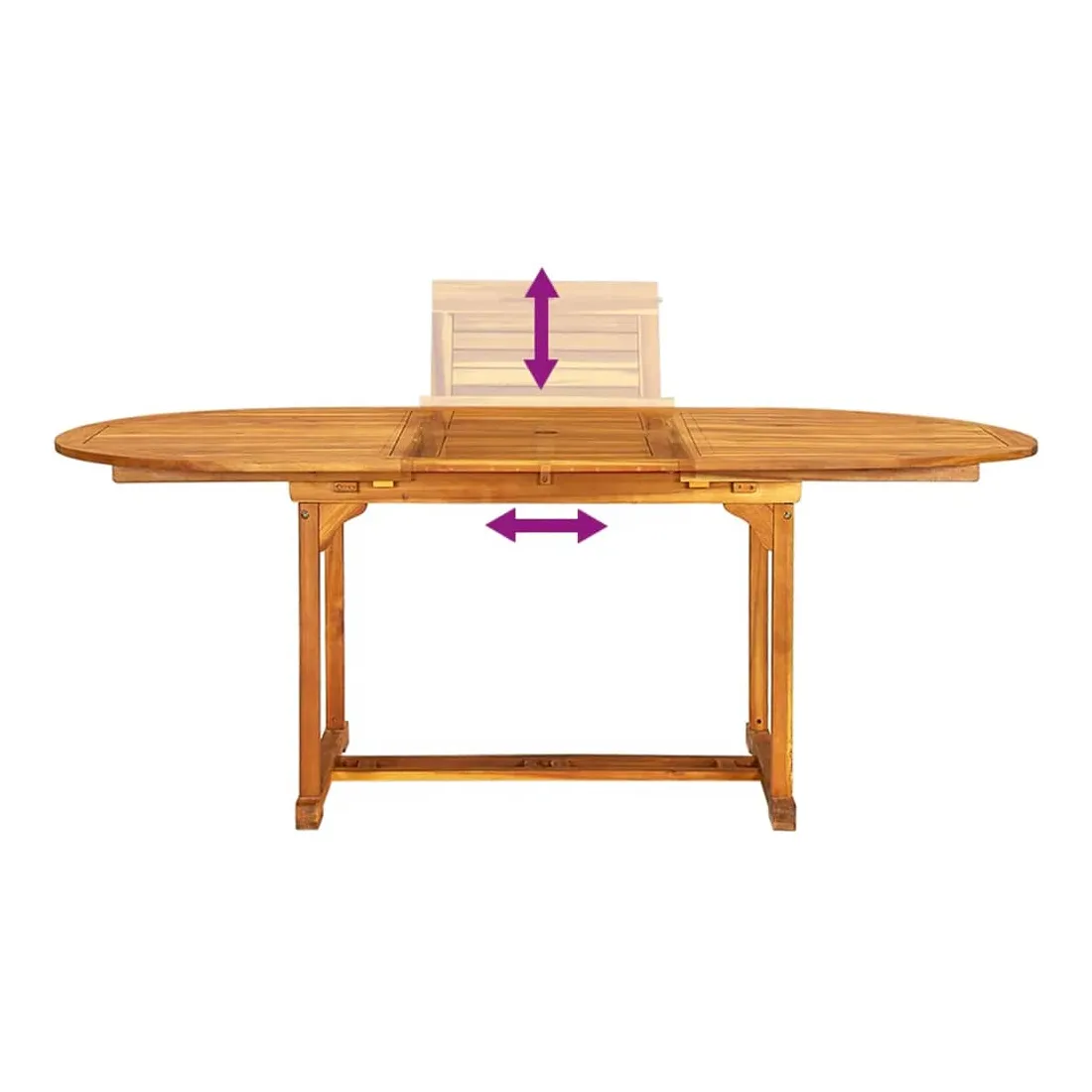 vidaXLProfitez d'un bon repas en plein air avec votre famille et vos amis avec cet ensemble de salle à manger de jardin en bois ! Bois d'acacia massif : l'ensemble à manger d’extérieur est fabriqué en bois d'acacia massif. Le bois d'acacia massif est un beau matériau naturel. Le bois d'acacia est un bois dur tropical, dense, robuste et durable. Fonction réglable et pliable : la chaise de jardin peut être réglée en 5 positions, afin que vous puissiez toujours trouver la position d'assise la plus confortable. Elle peut également être repliée pour économiser de l'espace lorsqu'elle n'est pas utilisée. Design pratique : grâce à son design spécial, cette table de jardin peut être rallongée lorsque de l'espace supplémentaire est nécessaire. De plus, il y a un trou pour parasol dans le dessus de la table, ce qui vous permet de fixer facilement un parasol pour créer un endroit ombragé. Dessus de table robuste : cette table à manger de jardin vous offre un dessus de table solide. Vous pouvez placer vos collations, boissons et n'importe laquelle de vos décorations préférées. Surface facile à nettoyer : la surface à finition à l'huile rend cette table et ces chaises de jardin faciles à nettoyer avec un chiffon humide. Bon à savoir :Pour que vos meubles d'extérieur restent beaux, nous vous recommandons de les protéger avec une housse imperméable.