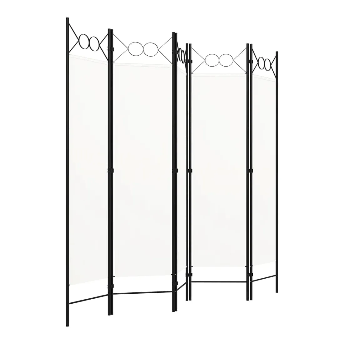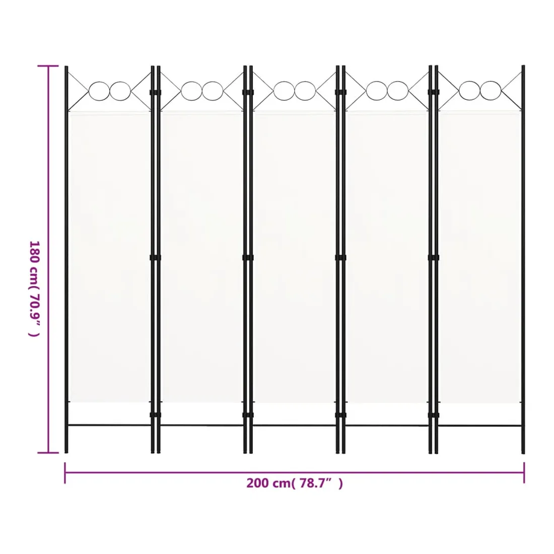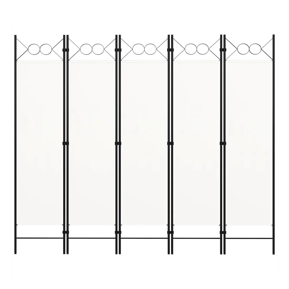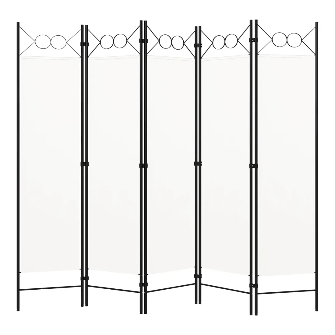 Notre cloison de séparation autoportante et pratique à 5 panneaux peut être utilisée comme cloison, écran d'intimité ou pour la décoration. Elle offre une intimité idéale dans la chambre à coucher ou un compartiment de la pièce. Le dessus avec un design circulaire ajoute une élégance supplémentaire. Cette cloison de séparation, composée d'un cadre en fer enduit de poudre et d'écrans en tissu, peut être facilement pliée lorsqu'elle n'est pas utilisée. Remarque : le tissu ne bloque pas complètement toute la lumière.