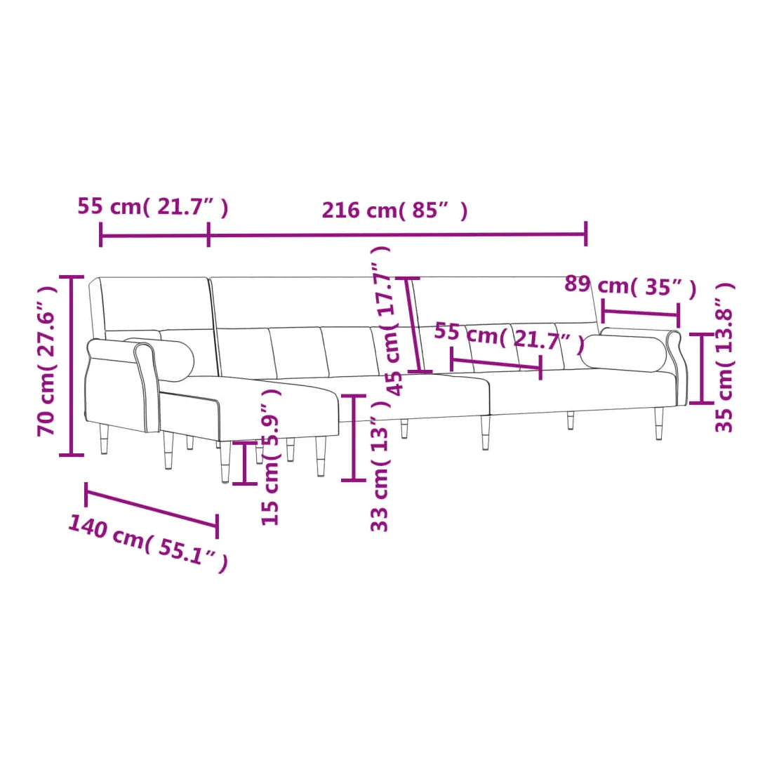 vidaXLCe canapé-lit en forme de L est parfait pour accueillir des invités pendant la nuit tout en offrant un espace confortable pour s'asseoir pendant la journée. Canapé-lit multifonctionnel : le canapé-lit est un choix judicieux pour les espaces limités. Il possède 3 positions convertibles pour s'asseoir, se prélasser et dormir, donc il peut être un canapé-lit inclinable confortable pour un usage quotidien ou un lit temporaire pour les invités.Velours doux : le velours est un tissu doux et luxueux qui se reconnaît à son tas dense de fibres uniformément coupées qui ont une touche lisse. Le tissu en velours présente un toucher doux distinctif, ce qui le rend confortable au toucher.Cadre robuste et stable : le cadre en contreplaqué du canapé-lit assure robustesse et stabilité.Expérience d'assise confortable : doté d'un revêtement en velours enveloppant une mousse haute densité, ce canapé-lit pliable offre un endroit confortable et douillet pour s'asseoir et dormir. Ses accoudoirs et son dossier offrent également une détente supplémentaire. Remarque :Le produit est assemblé à côté d'un canapé-lit et d'une chaise longue. Vous pouvez mettre la chaise longue à droite ou à gauche selon vos préférences.