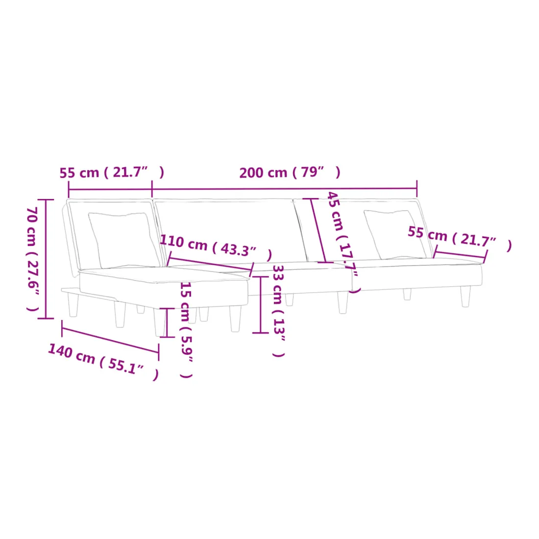 vidaXLCe canapé-lit en forme de L est parfait pour accueillir des invités pendant la nuit tout en offrant un espace confortable pour s'asseoir pendant la journée. Canapé-lit multifonctionnel : le canapé-lit est un choix judicieux pour les espaces limités. Il possède 3 positions convertibles pour s'asseoir, se prélasser et dormir, donc il peut être un canapé-lit inclinable confortable pour un usage quotidien ou un lit temporaire pour les invités.Velours doux : le velours est un tissu doux et luxueux qui se reconnaît à son tas dense de fibres uniformément coupées qui ont une touche lisse. Le tissu en velours présente un toucher doux distinctif, ce qui le rend confortable au toucher.Cadre robuste et stable : le cadre en contreplaqué du canapé-lit assure robustesse et stabilité.Expérience d'assise confortable : doté d'un revêtement en velours enveloppant une mousse haute densité, ce canapé-lit pliable offre un endroit confortable et douillet pour s'asseoir et dormir. Ses accoudoirs et son dossier offrent également une détente supplémentaire. Remarque :Le produit est assemblé à côté d'un canapé-lit et d'une chaise longue. Vous pouvez mettre la chaise longue à droite ou à gauche selon vos préférences.