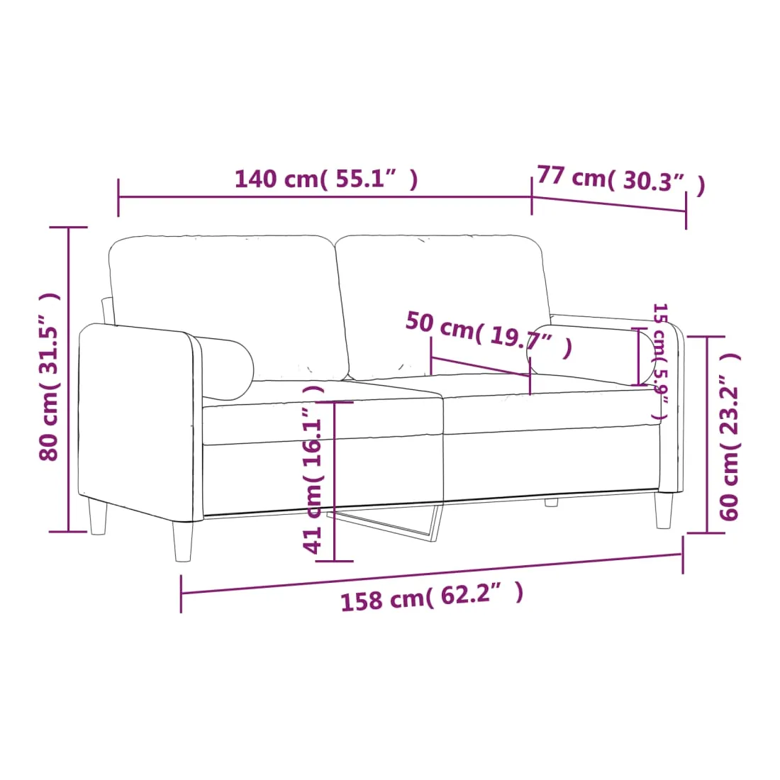 Ce canapé 2 places, qui se démarque par son design moderne et ses coussins décoratifs, sera un excellent endroit pour discuter, regarder la télévision ou simplement vous détendre. Velours doux : le velours est un tissu doux et luxueux qui se reconnaît à son tas dense de fibres uniformément coupées qui ont une touche lisse. Le tissu en velours présente un toucher doux distinctif, ce qui le rend agréable au toucher.Cadre robuste et stable : le cadre en métal du canapé de salon assure robustesse et stabilité.Housses d'oreillers amovibles : grâce à la fermeture éclair, les housses de ces oreillers de traversin sont faciles à retirer et à nettoyer en cas de besoin.Expérience d'assise confortable : le canapé est très confortable avec les sièges, les accoudoirs et les oreillers de dossier bien rembourrés. En outre, les oreillers décoratifs peuvent ajouter un confort supplémentaire lorsque vous êtes assis ou allongé.