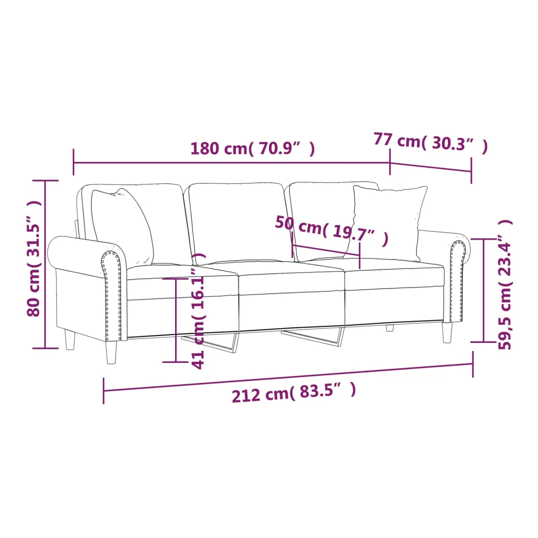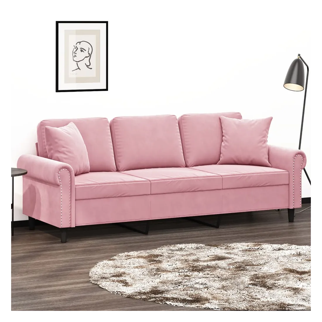 Ce canapé 3 places, qui se démarque par son design moderne et ses coussins décoratifs, sera un excellent endroit pour discuter, regarder la télévision ou simplement vous détendre. Velours doux : le velours est un tissu doux et luxueux qui se reconnaît à son tas dense de fibres uniformément coupées qui ont une touche lisse. Le tissu en velours présente un toucher doux distinctif, ce qui le rend agréable au toucher.Cadre robuste et stable : le cadre en métal du canapé de salon assure robustesse et stabilité.Oreillers décoratifs avec inserts : ces oreillers de canapé sont livrés avec des inserts en coton PP, vous n'avez donc pas besoin d'acheter des rembourrages.Expérience d'assise confortable : le canapé est très confortable avec les sièges, les accoudoirs et les oreillers de dossier bien rembourrés. En outre, les oreillers décoratifs peuvent ajouter un confort supplémentaire lorsque vous êtes assis ou allongé.