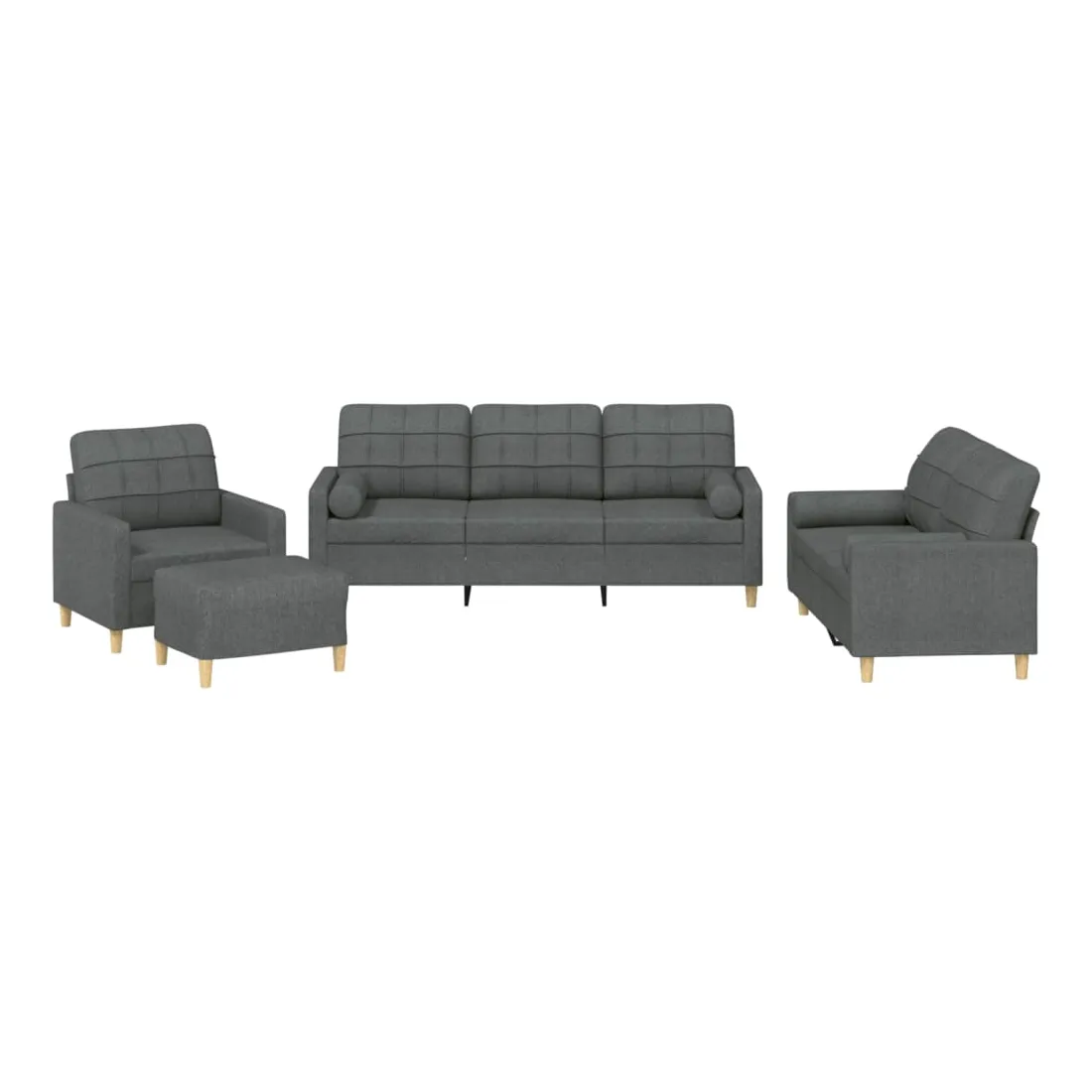 Cet ensemble de canapés est un excellent endroit pour discuter, lire, regarder la télévision ou simplement vous détendre. Il est destiné à être un point central de votre maison. Tissu durable : le tissu présente un aspect simple et épuré tout en restant respirant et durable.Structure robuste et stable : la structure en contreplaqué et en métal du canapé assure robustesse et stabilité.Expérience d'assise confortable : le canapé est très confortable avec le siège, les accoudoirs et les oreillers de dossier bien rembourrés.Oreillers cylindriques pratiques : ces oreillers cylindriques non seulement embellissent votre décor, mais ils peuvent également apporter un confort supplémentaire lorsque vous êtes assis ou allongé.Pouf polyvalent : ce repose-pied convient pour reposer vos pieds lorsque vous êtes allongé dans un canapé, ou pour vous offrir un siège supplémentaire dans votre pièce. De plus, le design simple et la taille compacte le rendent idéal pour presque tous vos espaces de vie.