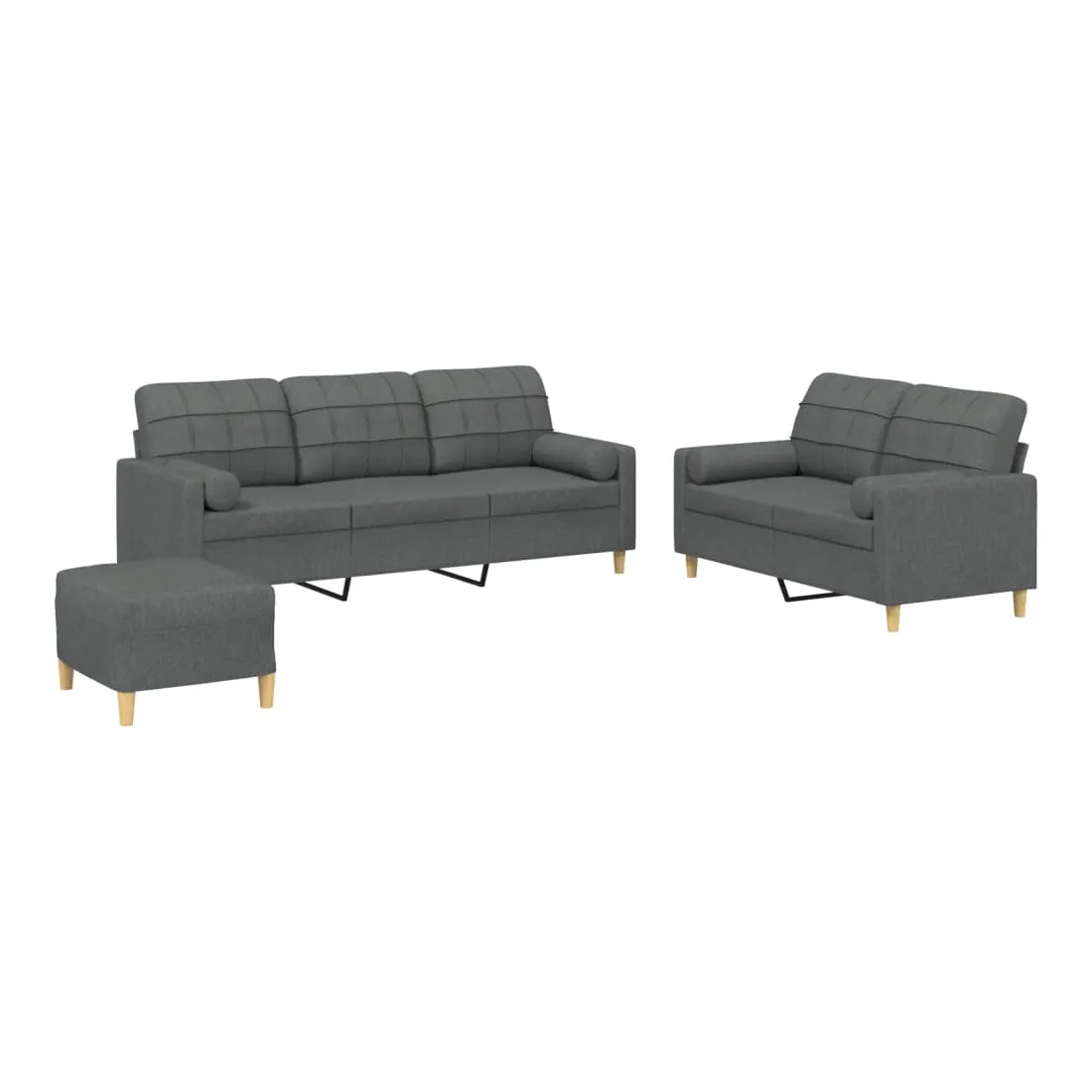 Cet ensemble de canapés est un excellent endroit pour discuter, lire, regarder la télévision ou simplement vous détendre. Il est destiné à être un point central de votre maison. Tissu durable : le tissu présente un aspect simple et épuré tout en restant respirant et durable.Structure robuste et stable : la structure en contreplaqué et en métal du canapé assure robustesse et stabilité.Expérience d'assise confortable : le canapé est très confortable avec le siège, les accoudoirs et les oreillers de dossier bien rembourrés.Oreillers cylindriques pratiques : ces oreillers cylindriques non seulement embellissent votre décor, mais ils peuvent également apporter un confort supplémentaire lorsque vous êtes assis ou allongé.Pouf polyvalent : ce repose-pied convient pour reposer vos pieds lorsque vous êtes allongé dans un canapé, ou pour vous offrir un siège supplémentaire dans votre pièce. De plus, le design simple et la taille compacte le rendent idéal pour presque tous vos espaces de vie.