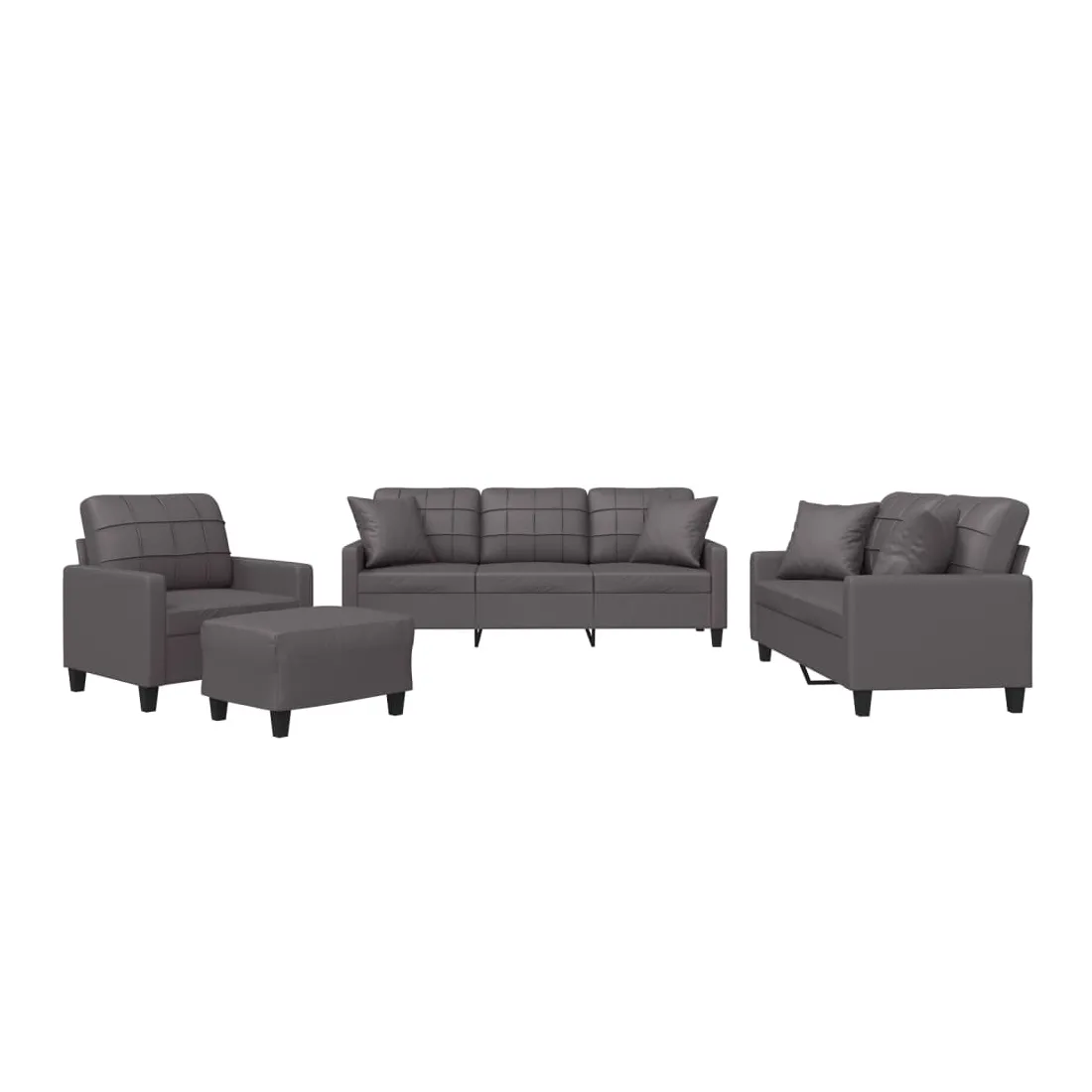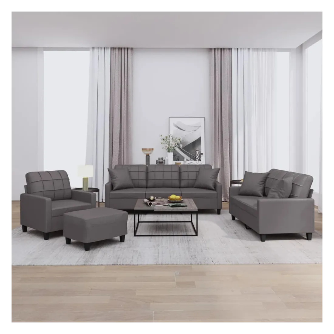Cet ensemble de canapés est un excellent endroit pour discuter, lire, regarder la télévision ou simplement vous détendre. Il est destiné à être un point central de votre maison. Similicuir durable : le similicuir de qualité supérieure est un matériau très durable. Il est résistant aux taches, ce qui le rend facile à nettoyer avec un chiffon humide. La surface lisse donne également un aspect luxueux et la beauté du cuir véritable.Structure robuste et stable : la structure en contreplaqué et en métal du canapé assure robustesse et stabilité.Expérience d'assise confortable : le canapé est très confortable avec le siège, les accoudoirs et les oreillers de dossier bien rembourrés.Oreillers de canapé pratiques : ces oreillers décoratifs carrés non seulement embellissent votre décor, mais ils peuvent également apporter un confort supplémentaire lorsque vous êtes assis ou allongé.Pouf polyvalent : ce repose-pied convient pour reposer vos pieds lorsque vous êtes allongé dans un canapé, ou pour vous offrir un siège supplémentaire dans votre pièce. De plus, le design simple et la taille compacte le rendent idéal pour presque tous vos espaces de vie.