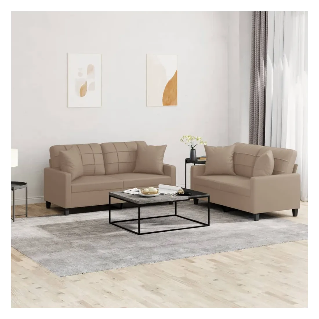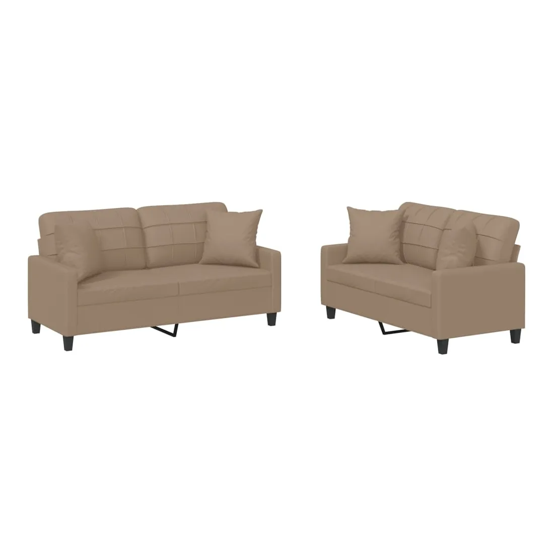 Cet ensemble de canapés est un excellent endroit pour discuter, lire, regarder la télévision ou simplement vous détendre. Il est destiné à être un point central de votre maison. Similicuir durable : le similicuir de qualité supérieure est un matériau très durable. Il est résistant aux taches, ce qui le rend facile à nettoyer avec un chiffon humide. La surface lisse donne également un aspect luxueux et la beauté du cuir véritable.Structure robuste et stable : la structure en contreplaqué et en métal du canapé assure robustesse et stabilité.Expérience d'assise confortable : le canapé est très confortable avec le siège, les accoudoirs et les oreillers de dossier bien rembourrés.Oreillers de canapé pratiques : ces oreillers décoratifs carrés non seulement embellissent votre décor, mais ils peuvent également apporter un confort supplémentaire lorsque vous êtes assis ou allongé.
