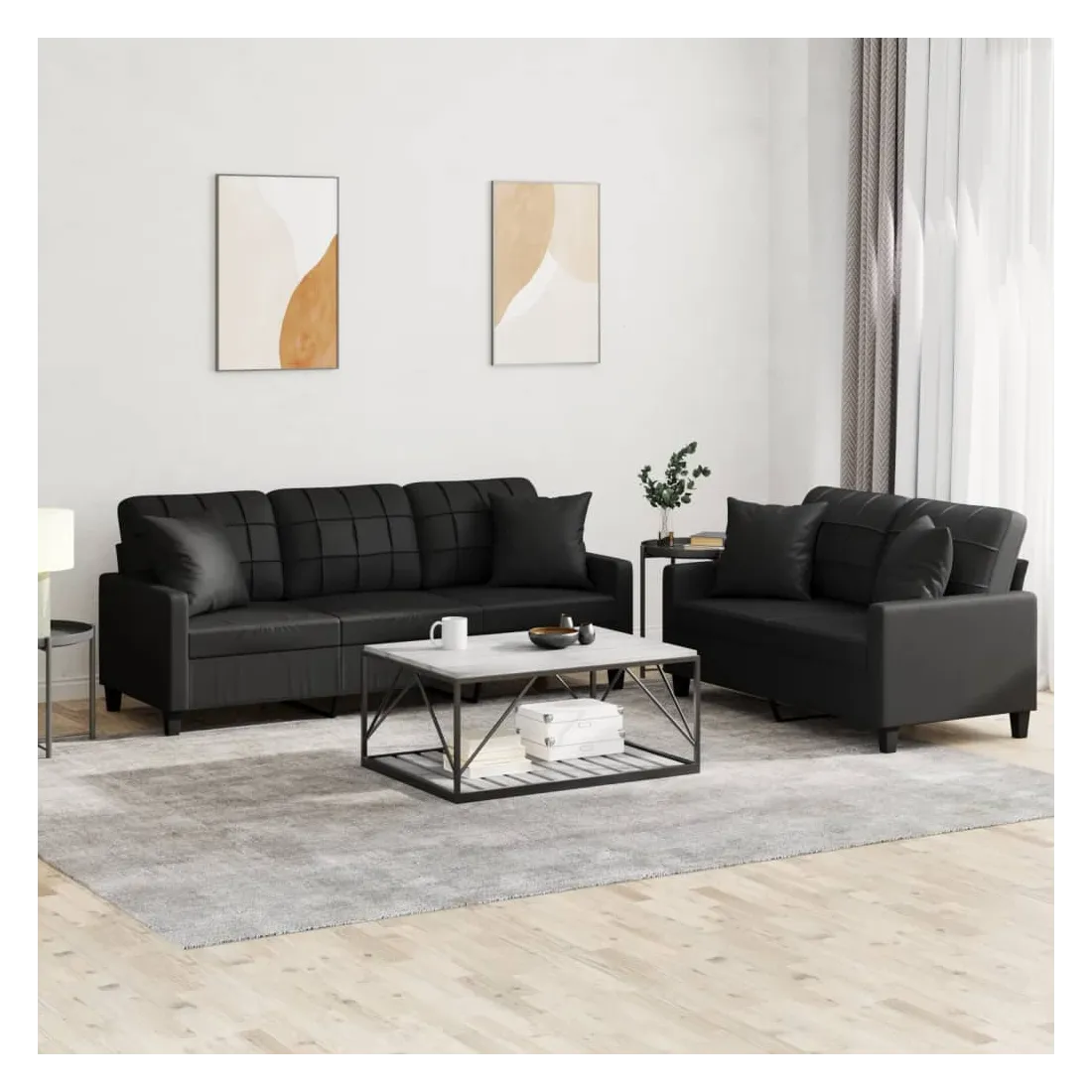 Cet ensemble de canapés est un excellent endroit pour discuter, lire, regarder la télévision ou simplement vous détendre. Il est destiné à être un point central de votre maison. Similicuir durable : le similicuir de qualité supérieure est un matériau très durable. Il est résistant aux taches, ce qui le rend facile à nettoyer avec un chiffon humide. La surface lisse donne également un aspect luxueux et la beauté du cuir véritable.Structure robuste et stable : la structure en contreplaqué et en métal du canapé assure robustesse et stabilité.Expérience d'assise confortable : le canapé est très confortable avec le siège, les accoudoirs et les oreillers de dossier bien rembourrés.Oreillers de canapé pratiques : ces oreillers décoratifs carrés non seulement embellissent votre décor, mais ils peuvent également apporter un confort supplémentaire lorsque vous êtes assis ou allongé.