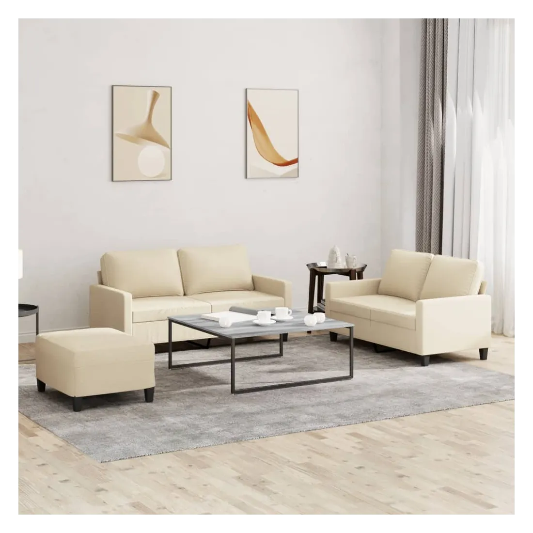 Cet ensemble de canapés est un excellent endroit pour discuter, lire, regarder la télévision ou simplement vous détendre. Il est destiné à être un point central de votre maison. Tissu durable : le tissu présente un aspect simple et épuré tout en restant respirant et durable.Structure robuste et stable : la structure en contreplaqué et en métal du canapé assure robustesse et stabilité.Expérience d'assise confortable : le canapé est très confortable grâce au siège et aux accoudoirs épais et rembourrés.Pouf polyvalent : ce repose-pied convient pour reposer vos pieds lorsque vous êtes allongé dans un canapé, ou pour vous offrir un siège supplémentaire dans votre pièce. De plus, le design simple et la taille compacte le rendent idéal pour presque tous vos espaces de vie.