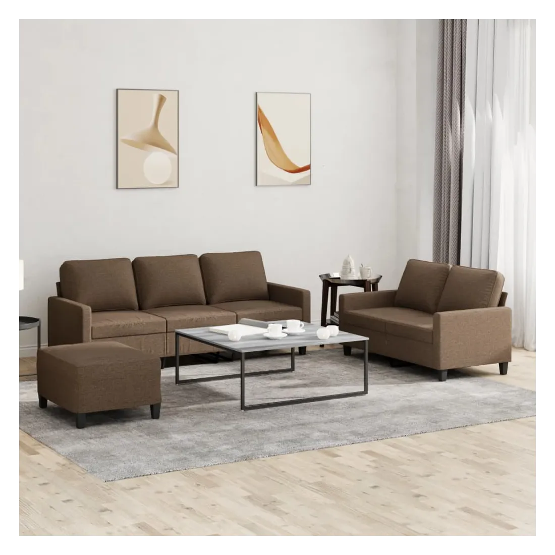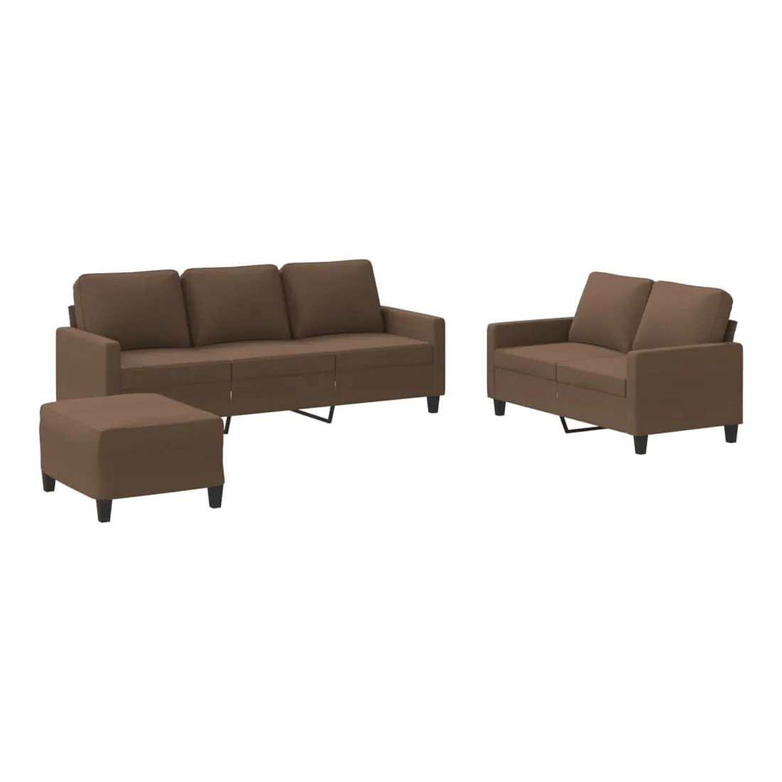 Cet ensemble de canapés est un excellent endroit pour discuter, lire, regarder la télévision ou simplement vous détendre. Il est destiné à être un point central de votre maison. Tissu durable : le tissu présente un aspect simple et épuré tout en restant respirant et durable.Structure robuste et stable : la structure en contreplaqué et en métal du canapé assure robustesse et stabilité.Expérience d'assise confortable : le canapé est très confortable grâce au siège et aux accoudoirs épais et rembourrés.Pouf polyvalent : ce repose-pied convient pour reposer vos pieds lorsque vous êtes allongé dans un canapé, ou pour vous offrir un siège supplémentaire dans votre pièce. De plus, le design simple et la taille compacte le rendent idéal pour presque tous vos espaces de vie.