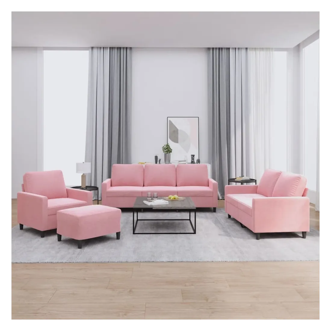 Cet ensemble de canapés est un excellent endroit pour discuter, lire, regarder la télévision ou simplement vous détendre. Il est destiné à être un point central de votre maison. Velours doux : le velours est un tissu doux et confortable, agréable au toucher.Structure robuste et stable : la structure en contreplaqué et en métal du canapé assure robustesse et stabilité.Expérience d'assise confortable : le canapé est très confortable grâce au siège et aux accoudoirs épais et rembourrés.Pouf polyvalent : ce repose-pied convient pour reposer vos pieds lorsque vous êtes allongé dans un canapé, ou pour vous offrir un siège supplémentaire dans votre pièce. De plus, le design simple et la taille compacte le rendent idéal pour presque tous vos espaces de vie.