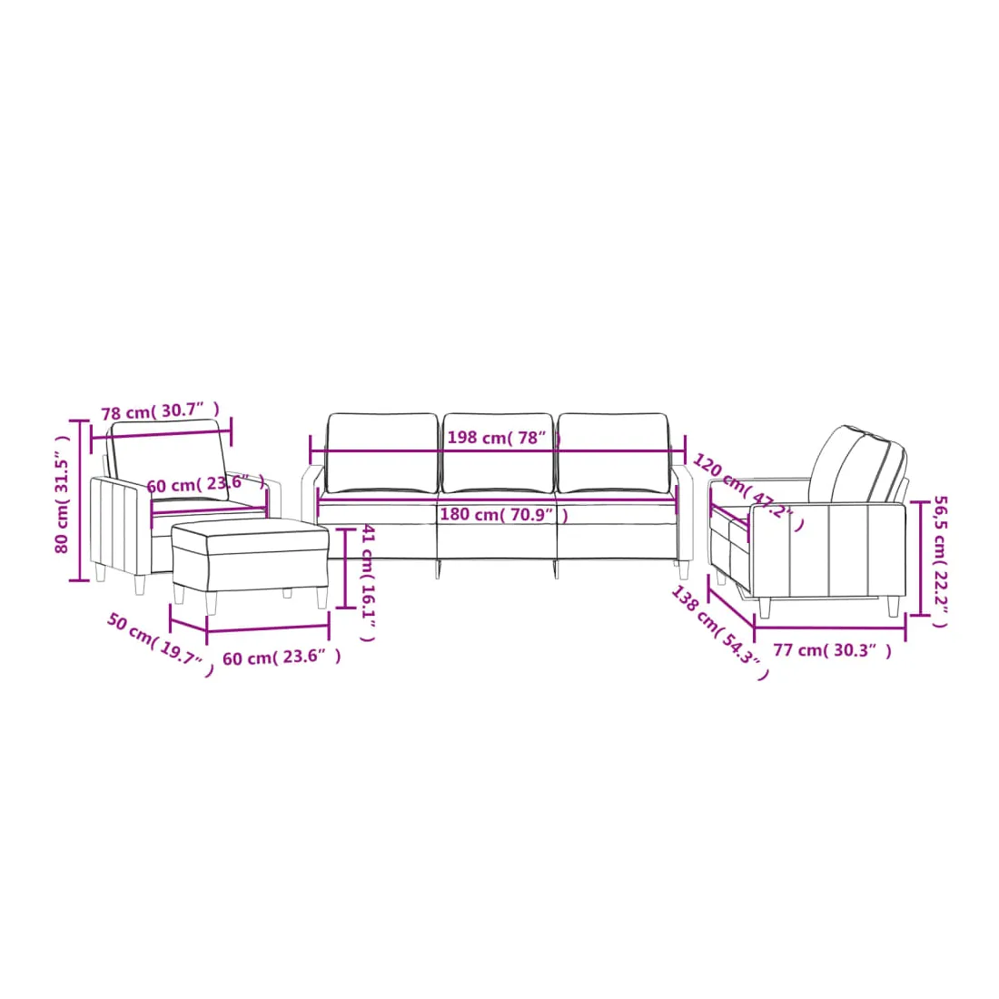 - Dimensions totales : 198 x 77 x 80 cm (l x P x H)