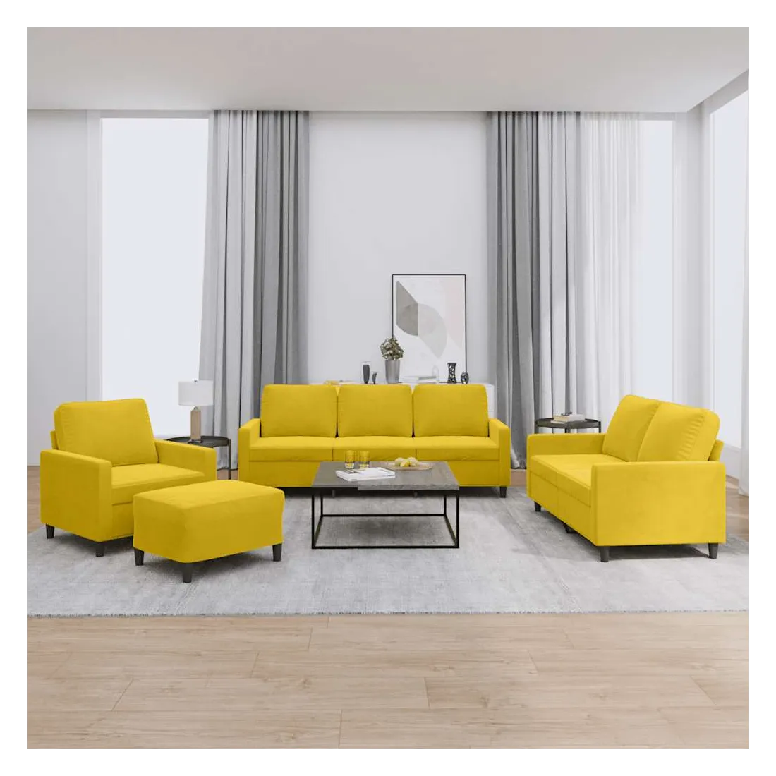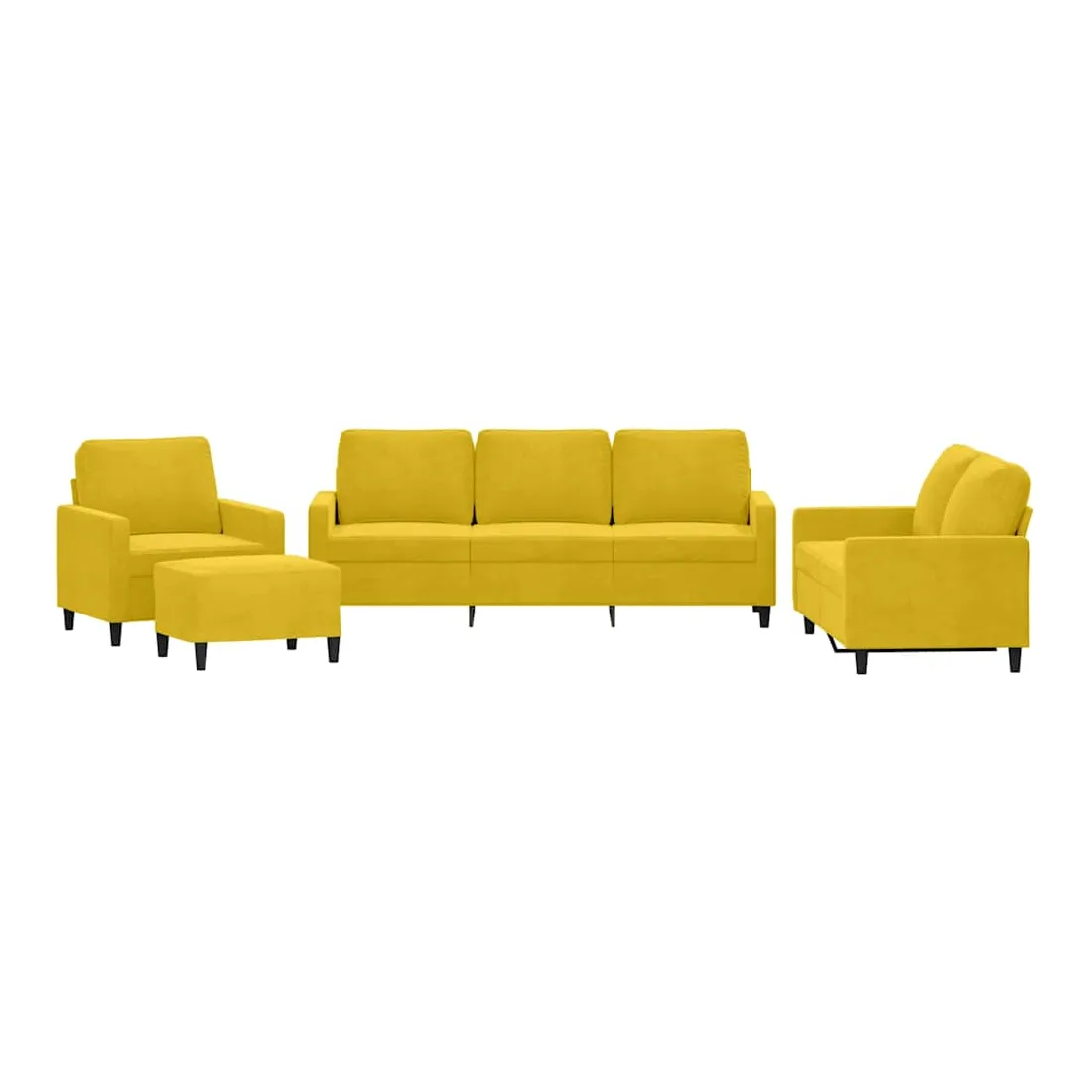 Cet ensemble de canapés est un excellent endroit pour discuter, lire, regarder la télévision ou simplement vous détendre. Il est destiné à être un point central de votre maison. Velours doux : le velours est un tissu doux et confortable, agréable au toucher.Structure robuste et stable : la structure en contreplaqué et en métal du canapé assure robustesse et stabilité.Expérience d'assise confortable : le canapé est très confortable grâce au siège et aux accoudoirs épais et rembourrés.Pouf polyvalent : ce repose-pied convient pour reposer vos pieds lorsque vous êtes allongé dans un canapé, ou pour vous offrir un siège supplémentaire dans votre pièce. De plus, le design simple et la taille compacte le rendent idéal pour presque tous vos espaces de vie.