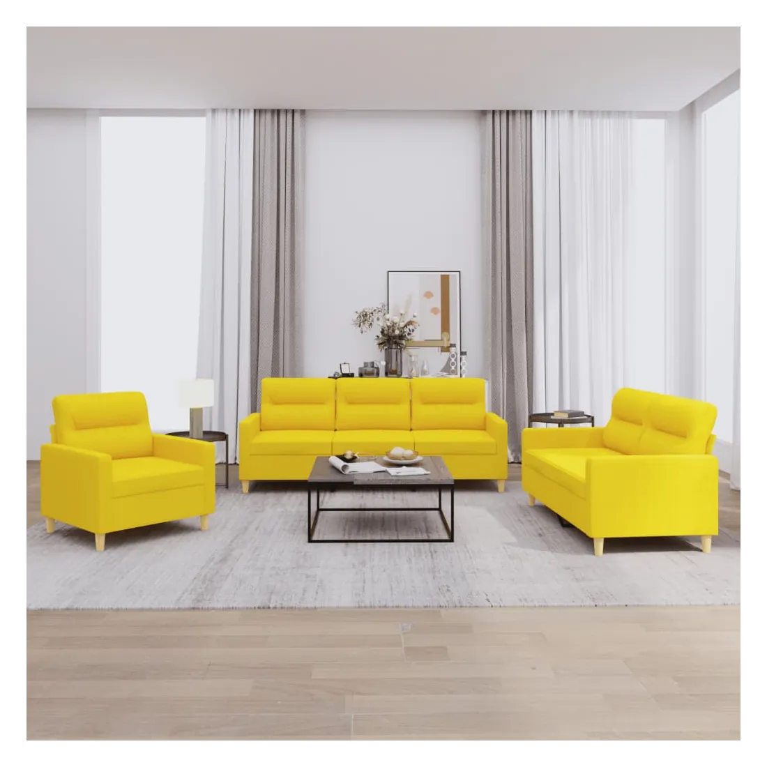 Cet ensemble de canapés est un excellent endroit pour discuter, lire, regarder la télévision ou simplement vous détendre. Il est destiné à être un point central de votre maison. Tissu durable : le tissu présente un aspect simple et épuré tout en restant respirant et durable.Structure robuste et stable : la structure en contreplaqué et en métal du canapé assure robustesse et stabilité.Expérience d'assise confortable : le canapé est très confortable grâce au siège et aux accoudoirs épais et rembourrés.