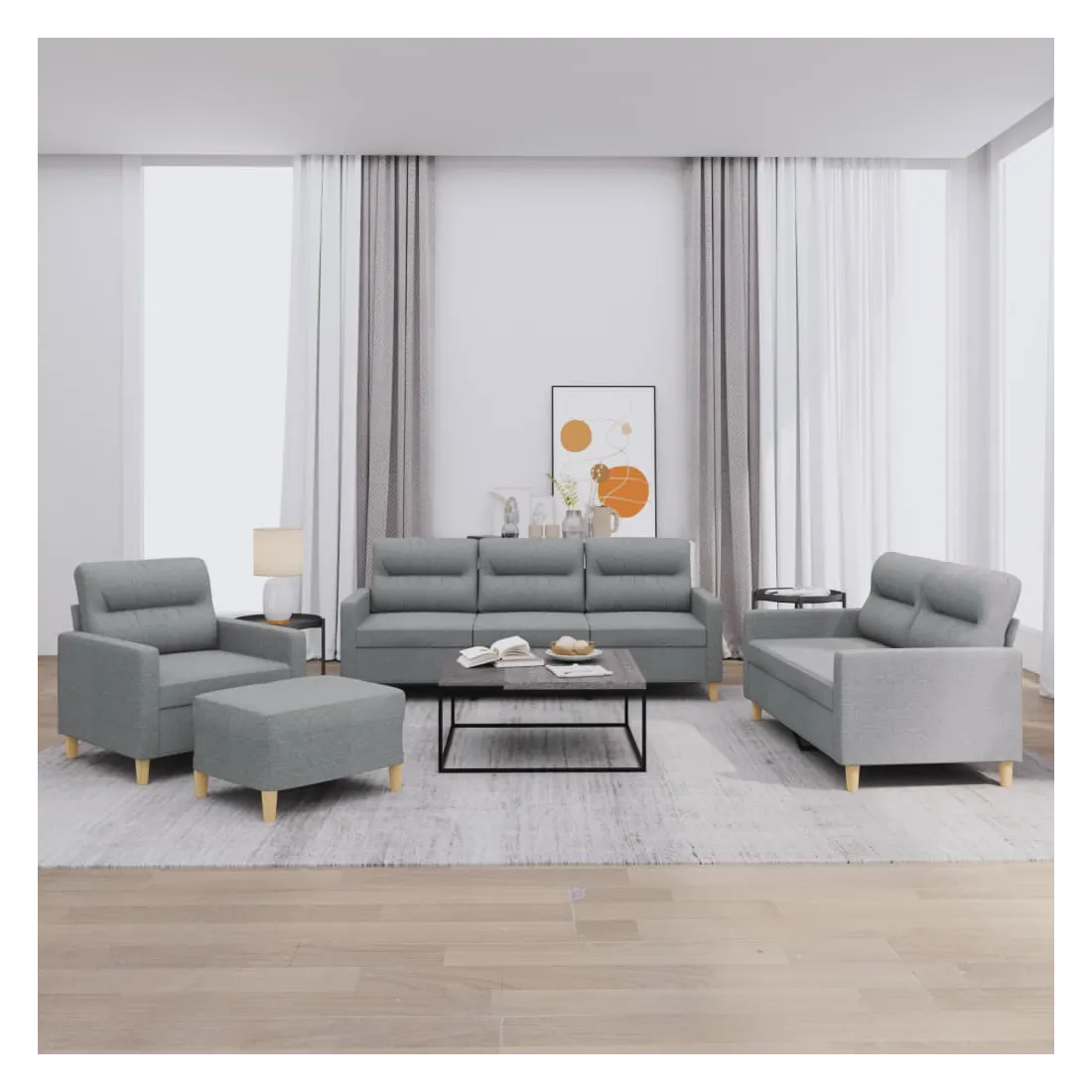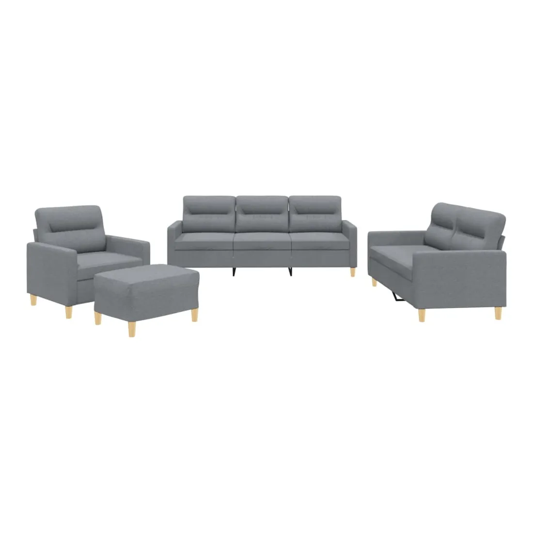 Cet ensemble de canapés est un excellent endroit pour discuter, lire, regarder la télévision ou simplement vous détendre. Il est destiné à être un point central de votre maison. Tissu durable : le tissu présente un aspect simple et épuré tout en restant respirant et durable.Structure robuste et stable : la structure en contreplaqué et en métal du canapé assure robustesse et stabilité.Expérience d'assise confortable : le canapé est très confortable grâce au siège et aux accoudoirs épais et rembourrés.Pouf polyvalent : ce repose-pied convient pour reposer vos pieds lorsque vous êtes allongé dans un canapé, ou pour vous offrir un siège supplémentaire dans votre pièce. De plus, le design simple et la taille compacte le rendent idéal pour presque tous vos espaces de vie.