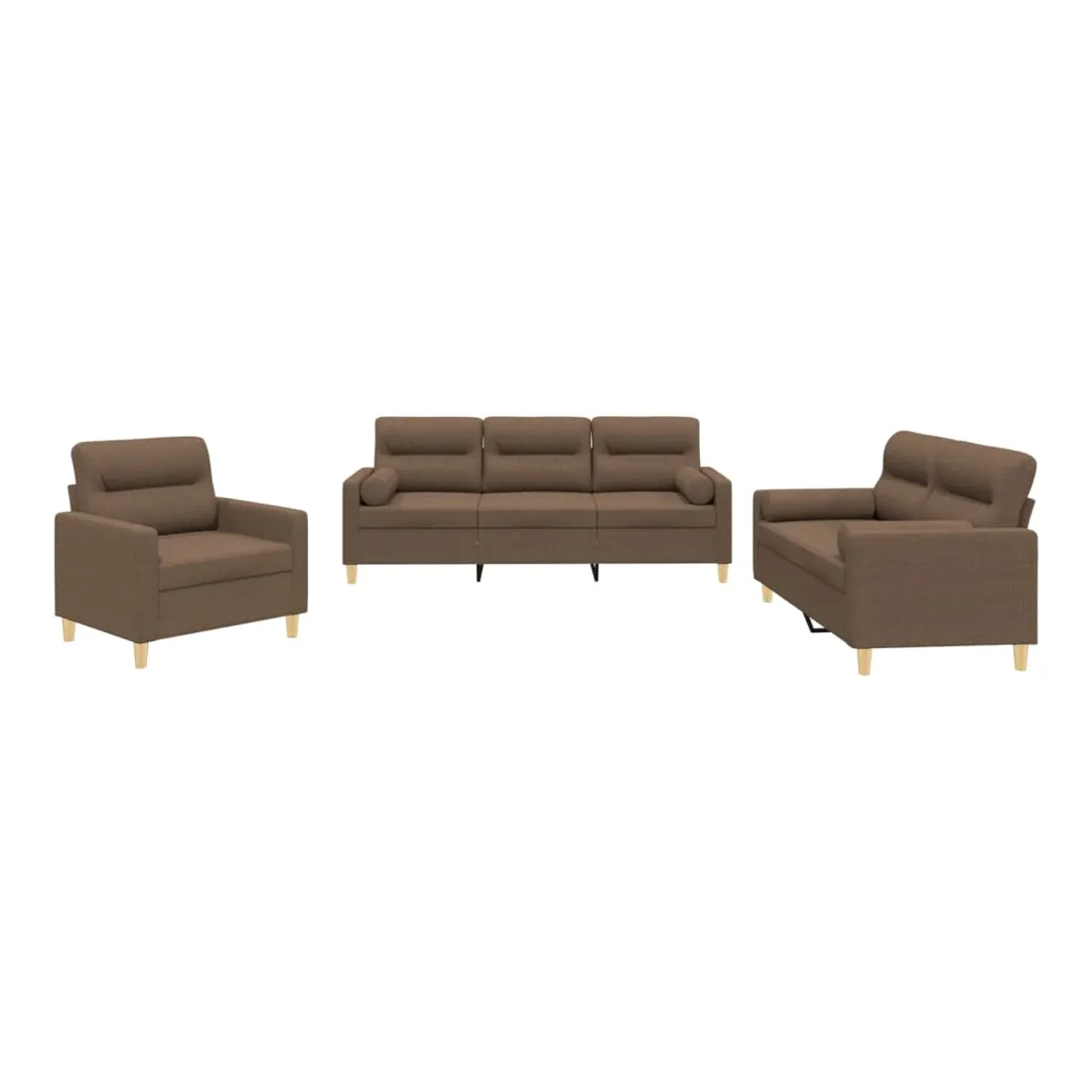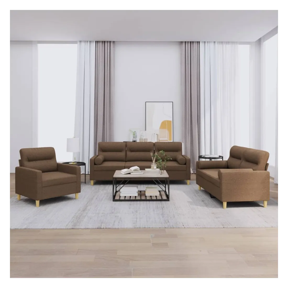 Cet ensemble de canapés est un excellent endroit pour discuter, lire, regarder la télévision ou simplement vous détendre. Il est destiné à être un point central de votre maison. Tissu durable : le tissu présente un aspect simple et épuré tout en restant respirant et durable.Structure robuste et stable : la structure en contreplaqué et en métal du canapé assure robustesse et stabilité.Expérience d'assise confortable : le canapé est très confortable avec le siège, les accoudoirs et les oreillers de dossier bien rembourrés.Oreillers cylindriques pratiques : ces oreillers cylindriques non seulement embellissent votre décor, mais ils peuvent également apporter un confort supplémentaire lorsque vous êtes assis ou allongé.