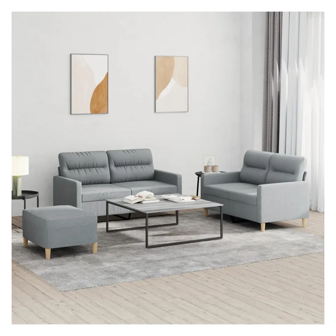 Cet ensemble de canapés est un excellent endroit pour discuter, lire, regarder la télévision ou simplement vous détendre. Il est destiné à être un point central de votre maison. Tissu durable : le tissu présente un aspect simple et épuré tout en restant respirant et durable.Structure robuste et stable : la structure en contreplaqué et en métal du canapé assure robustesse et stabilité.Expérience d'assise confortable : le canapé est très confortable grâce au siège et aux accoudoirs épais et rembourrés.Pouf polyvalent : ce repose-pied convient pour reposer vos pieds lorsque vous êtes allongé dans un canapé, ou pour vous offrir un siège supplémentaire dans votre pièce. De plus, le design simple et la taille compacte le rendent idéal pour presque tous vos espaces de vie.
