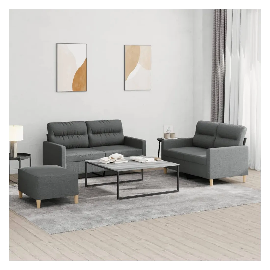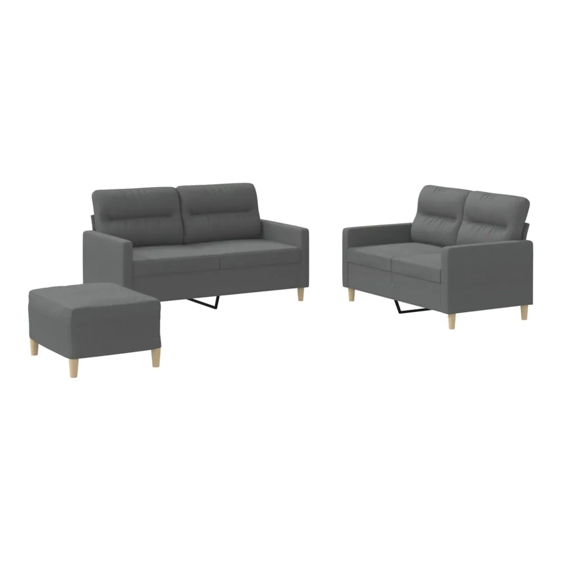 Cet ensemble de canapés est un excellent endroit pour discuter, lire, regarder la télévision ou simplement vous détendre. Il est destiné à être un point central de votre maison. Tissu durable : le tissu présente un aspect simple et épuré tout en restant respirant et durable.Structure robuste et stable : la structure en contreplaqué et en métal du canapé assure robustesse et stabilité.Expérience d'assise confortable : le canapé est très confortable grâce au siège et aux accoudoirs épais et rembourrés.Pouf polyvalent : ce repose-pied convient pour reposer vos pieds lorsque vous êtes allongé dans un canapé, ou pour vous offrir un siège supplémentaire dans votre pièce. De plus, le design simple et la taille compacte le rendent idéal pour presque tous vos espaces de vie.