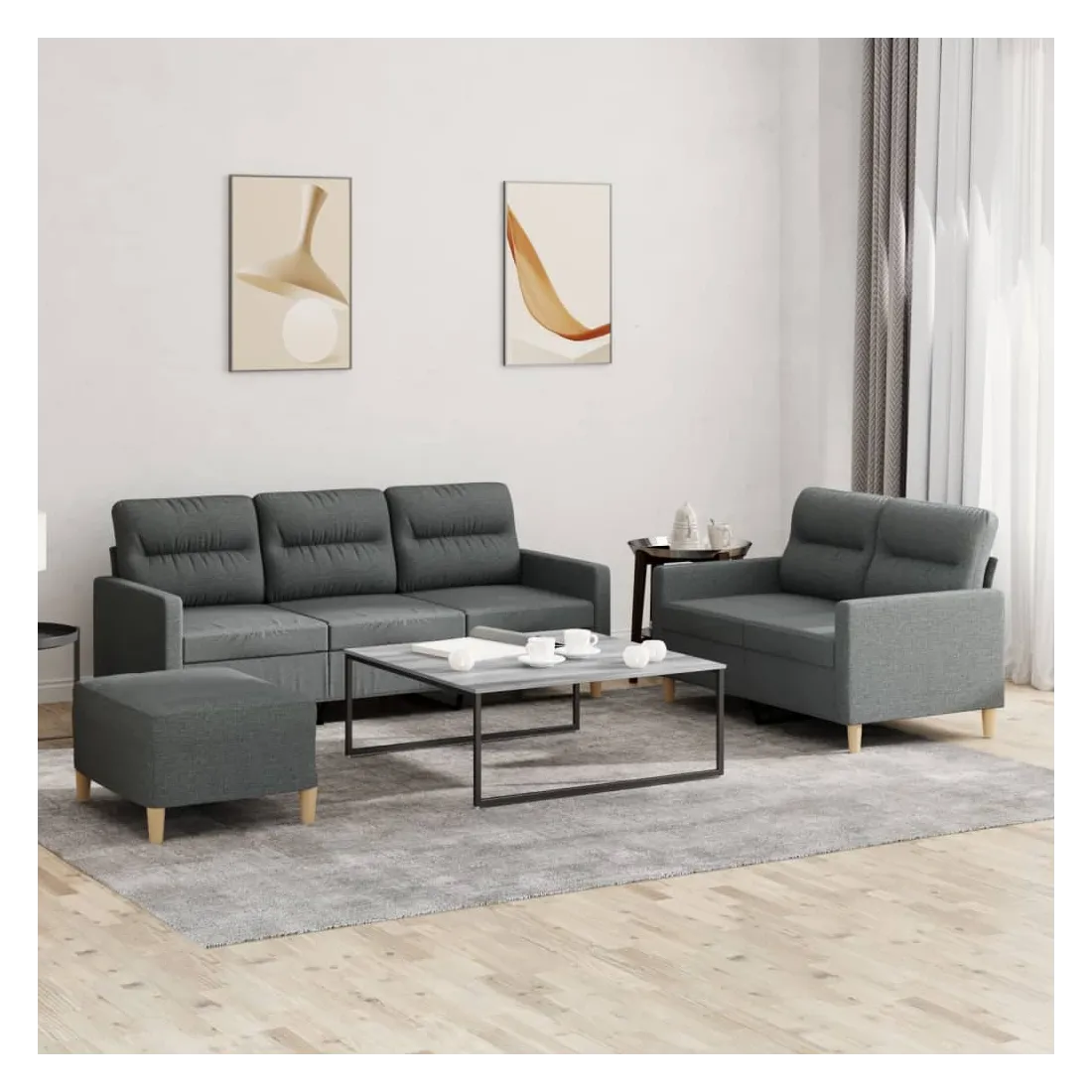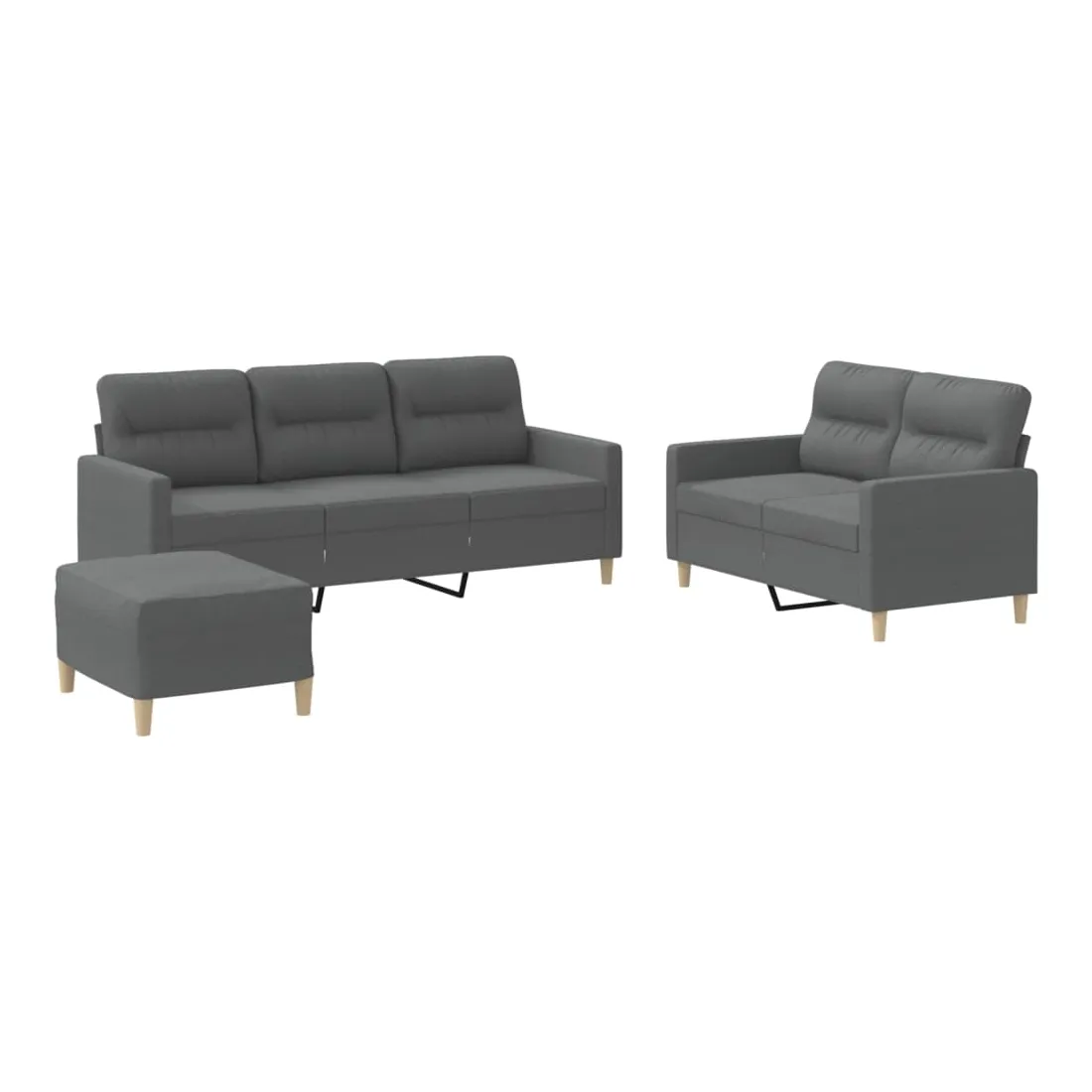 Cet ensemble de canapés est un excellent endroit pour discuter, lire, regarder la télévision ou simplement vous détendre. Il est destiné à être un point central de votre maison. Tissu durable : le tissu présente un aspect simple et épuré tout en restant respirant et durable.Structure robuste et stable : la structure en contreplaqué et en métal du canapé assure robustesse et stabilité.Expérience d'assise confortable : le canapé est très confortable grâce au siège et aux accoudoirs épais et rembourrés.Pouf polyvalent : ce repose-pied convient pour reposer vos pieds lorsque vous êtes allongé dans un canapé, ou pour vous offrir un siège supplémentaire dans votre pièce. De plus, le design simple et la taille compacte le rendent idéal pour presque tous vos espaces de vie.