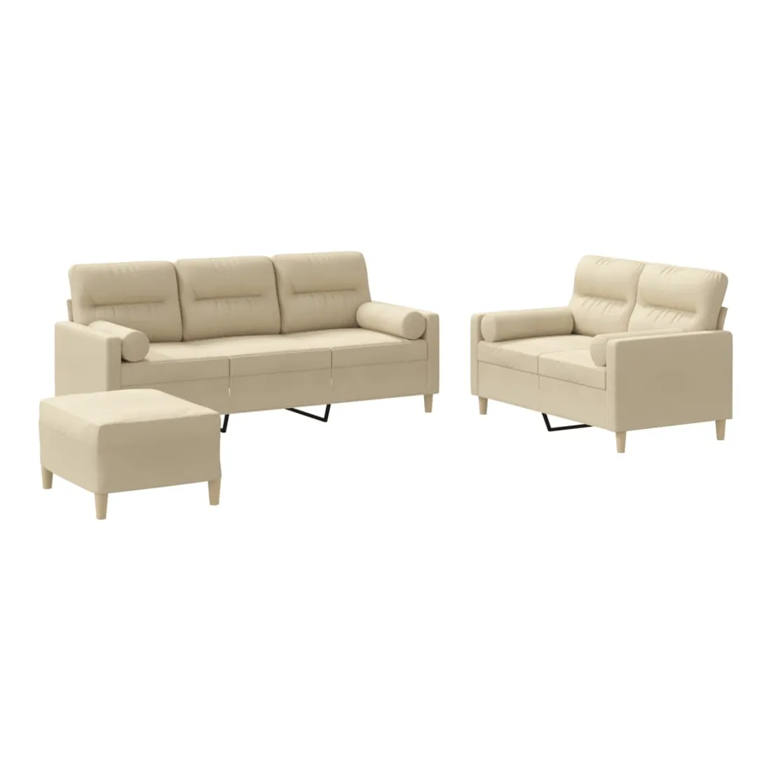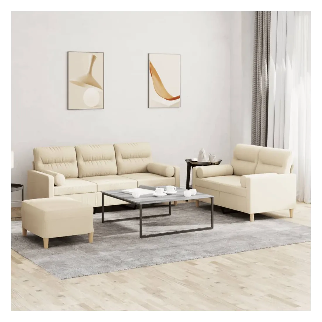 Cet ensemble de canapés est un excellent endroit pour discuter, lire, regarder la télévision ou simplement vous détendre. Il est destiné à être un point central de votre maison. Tissu durable : le tissu présente un aspect simple et épuré tout en restant respirant et durable.Structure robuste et stable : la structure en contreplaqué et en métal du canapé assure robustesse et stabilité.Expérience d'assise confortable : le canapé est très confortable grâce au siège et aux accoudoirs épais et rembourrés.Oreillers cylindriques pratiques : ces oreillers cylindriques non seulement embellissent votre décor, mais ils peuvent également apporter un confort supplémentaire lorsque vous êtes assis ou allongé.Pouf polyvalent : ce repose-pied convient pour reposer vos pieds lorsque vous êtes allongé dans un canapé, ou pour vous offrir un siège supplémentaire dans votre pièce. De plus, le design simple et la taille compacte le rendent idéal pour presque tous vos espaces de vie.