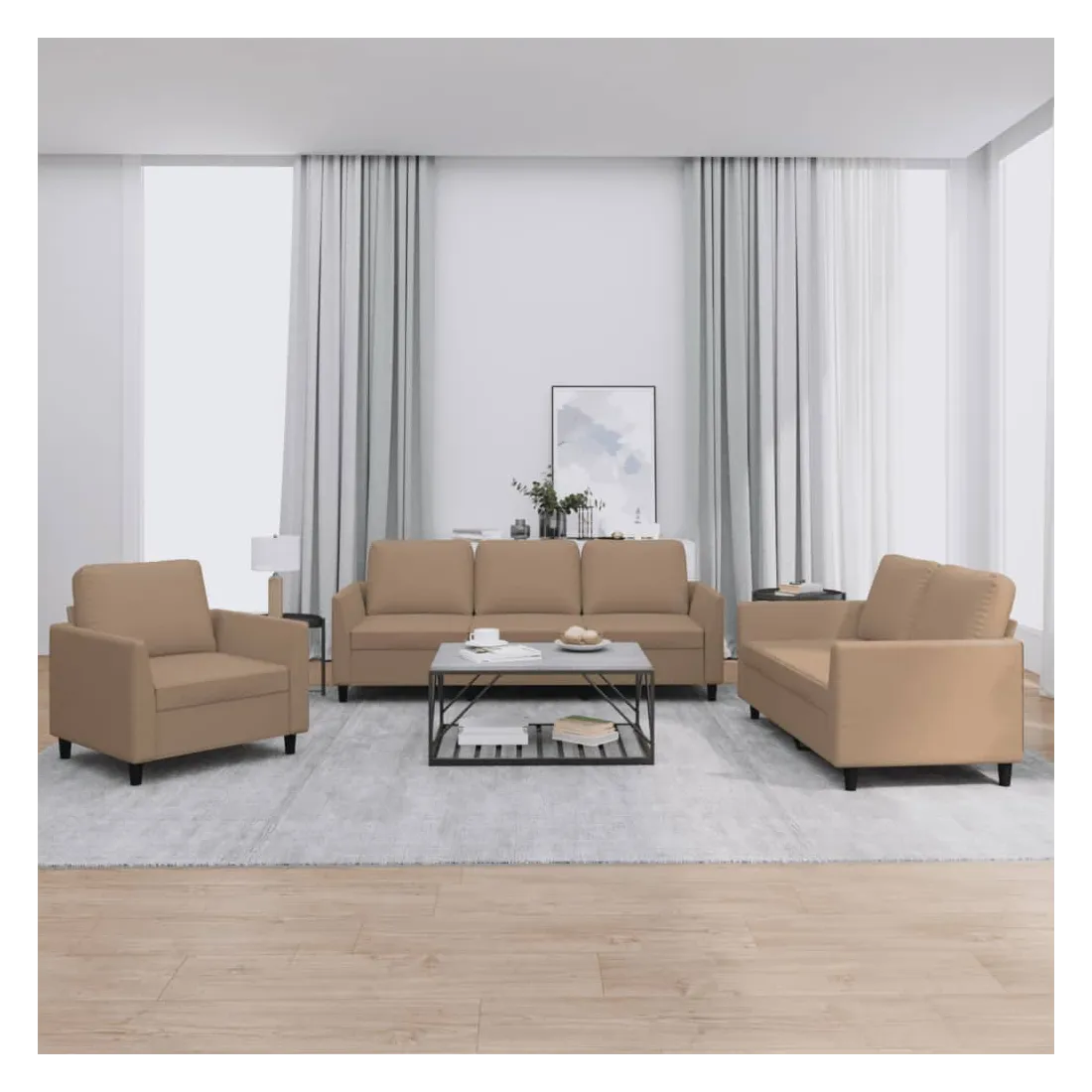 Cet ensemble de canapés est un excellent endroit pour discuter, lire, regarder la télévision ou simplement vous détendre. Il est destiné à être un point central de votre maison. Similicuir durable : le similicuir de qualité supérieure est un matériau très durable. Il est résistant aux taches, ce qui le rend facile à nettoyer avec un chiffon humide. La surface lisse donne également un aspect luxueux et la beauté du cuir véritable.Structure robuste et stable : la structure en contreplaqué et en métal du canapé assure robustesse et stabilité. Expérience d'assise confortable : le canapé est très confortable avec le siège, les accoudoirs et les oreillers de dossier bien rembourrés.