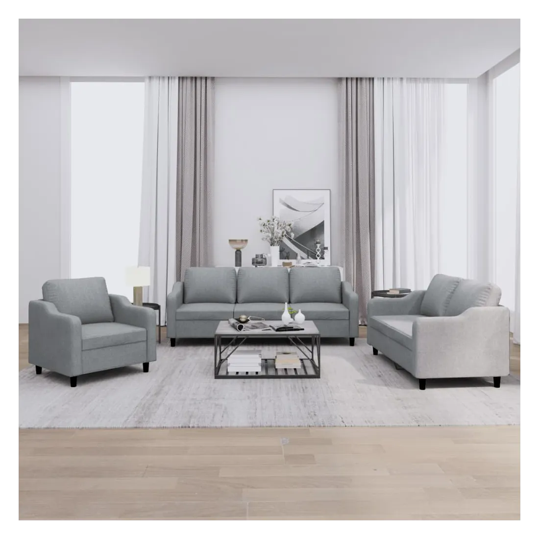 Cet ensemble de canapés est un excellent endroit pour discuter, lire, regarder la télévision ou simplement vous détendre. Il est destiné à être un point central de votre maison. Tissu durable : le tissu présente un aspect simple et épuré tout en restant respirant et durable.Structure robuste et stable : la structure en contreplaqué et en métal du canapé assure robustesse et stabilité. Expérience d'assise confortable : le canapé est très confortable avec le siège, les accoudoirs et les oreillers de dossier bien rembourrés.