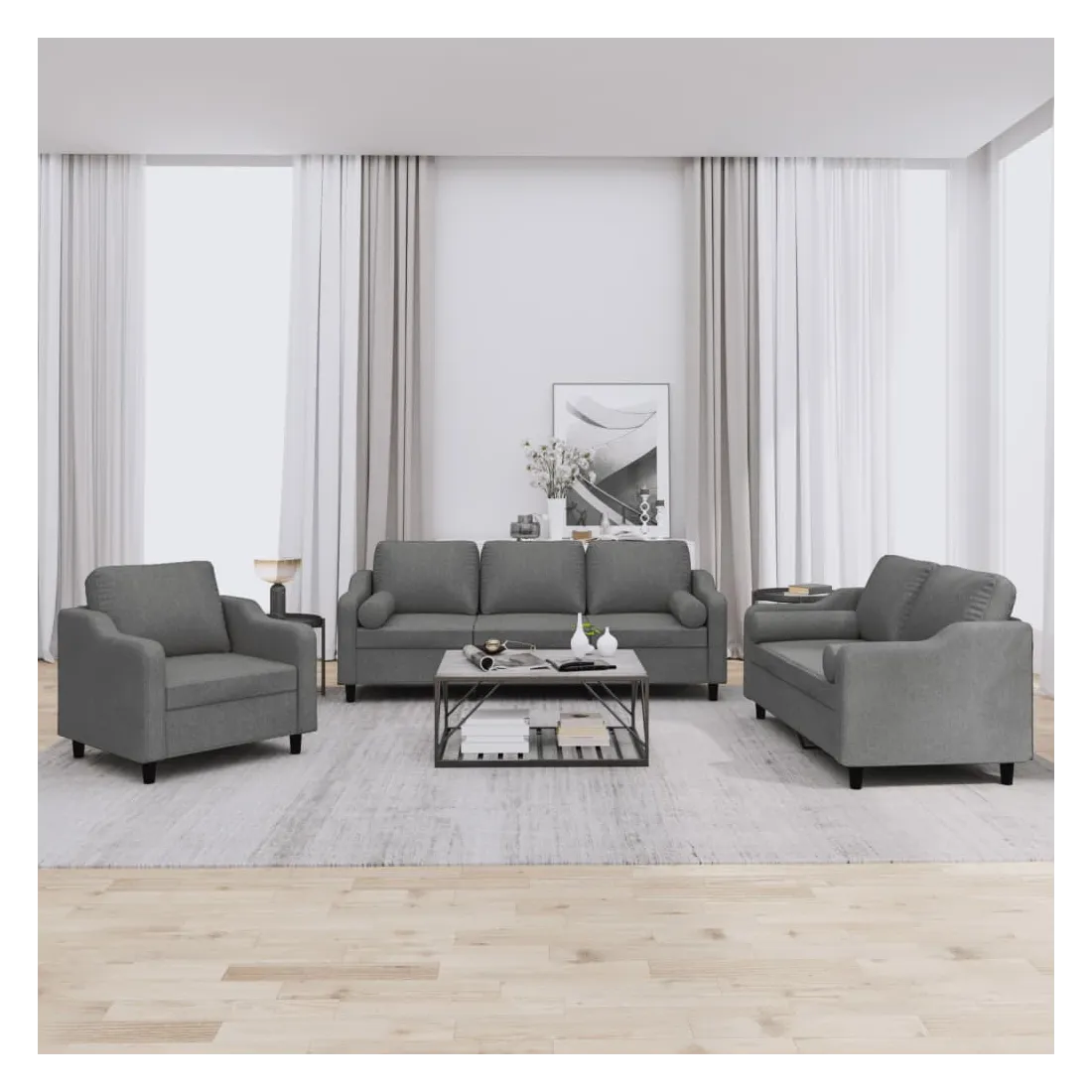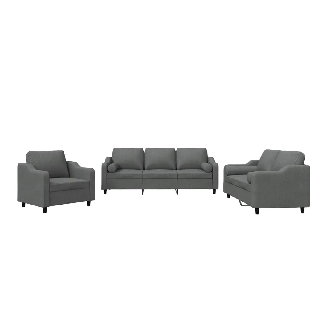 Cet ensemble de canapés est un excellent endroit pour discuter, lire, regarder la télévision ou simplement vous détendre. Il est destiné à être un point central de votre maison. Tissu durable : le tissu présente un aspect simple et épuré tout en restant respirant et durable.Structure robuste et stable : la structure en contreplaqué et en métal du canapé assure robustesse et stabilité. Expérience d'assise confortable : le canapé est très confortable avec le siège, les accoudoirs et les oreillers de dossier bien rembourrés. Oreillers cylindriques pratiques : ces oreillers cylindriques non seulement embellissent votre décor mais ils peuvent également apporter un confort supplémentaire lorsque vous êtes assis ou allongé.