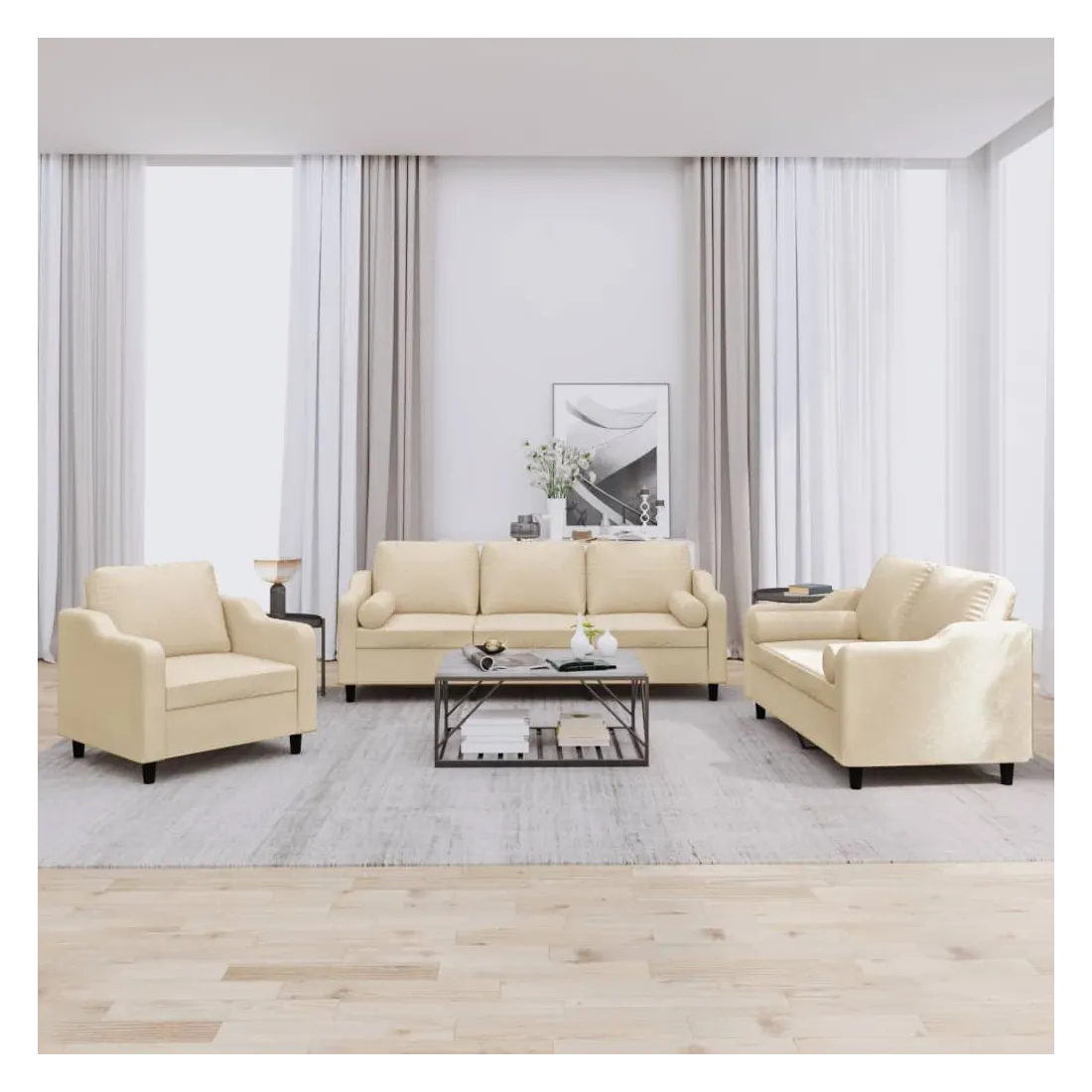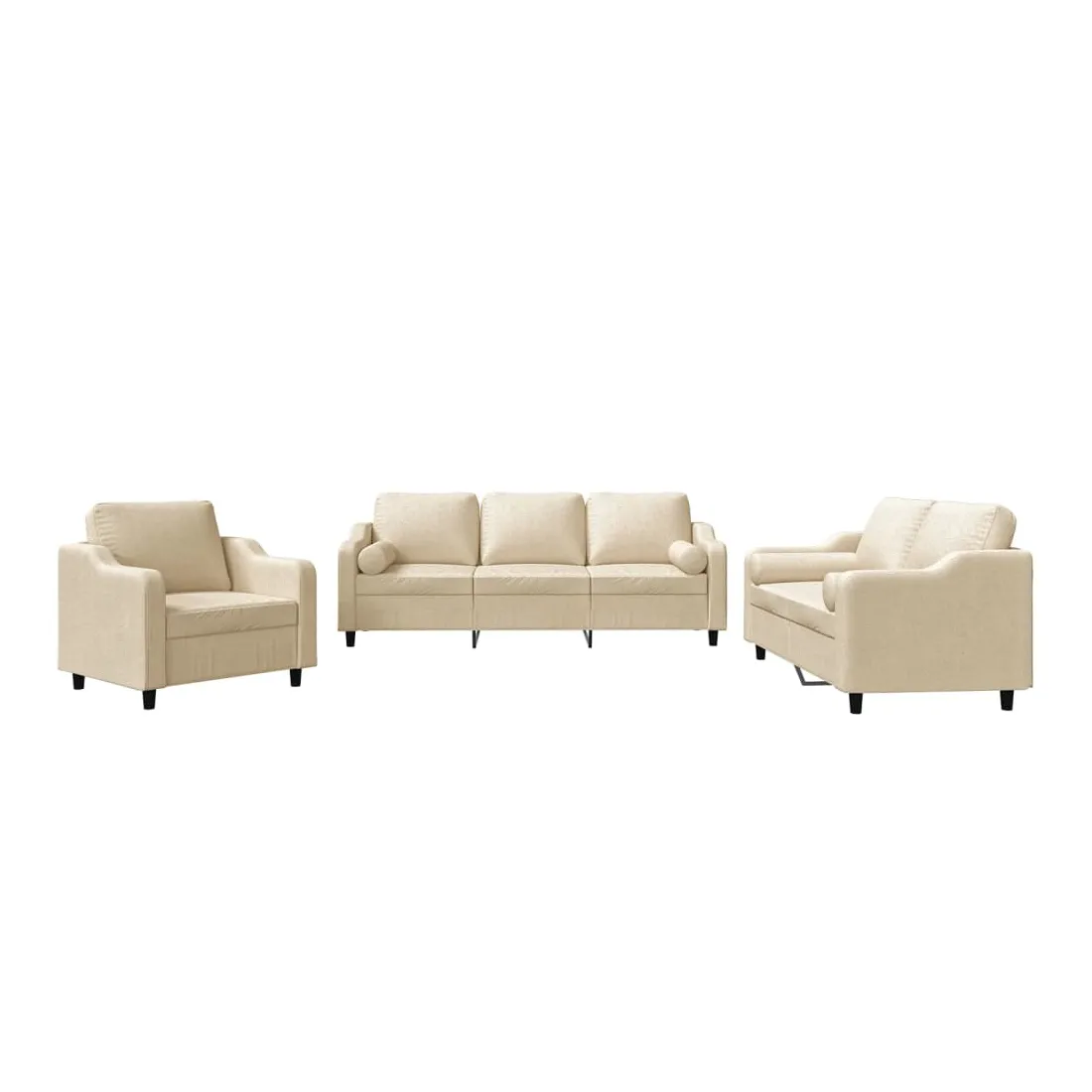 Cet ensemble de canapés est un excellent endroit pour discuter, lire, regarder la télévision ou simplement vous détendre. Il est destiné à être un point central de votre maison. Tissu durable : le tissu présente un aspect simple et épuré tout en restant respirant et durable.Structure robuste et stable : la structure en contreplaqué et en métal du canapé assure robustesse et stabilité. Expérience d'assise confortable : le canapé est très confortable avec le siège, les accoudoirs et les oreillers de dossier bien rembourrés. Oreillers cylindriques pratiques : ces oreillers cylindriques non seulement embellissent votre décor mais ils peuvent également apporter un confort supplémentaire lorsque vous êtes assis ou allongé.