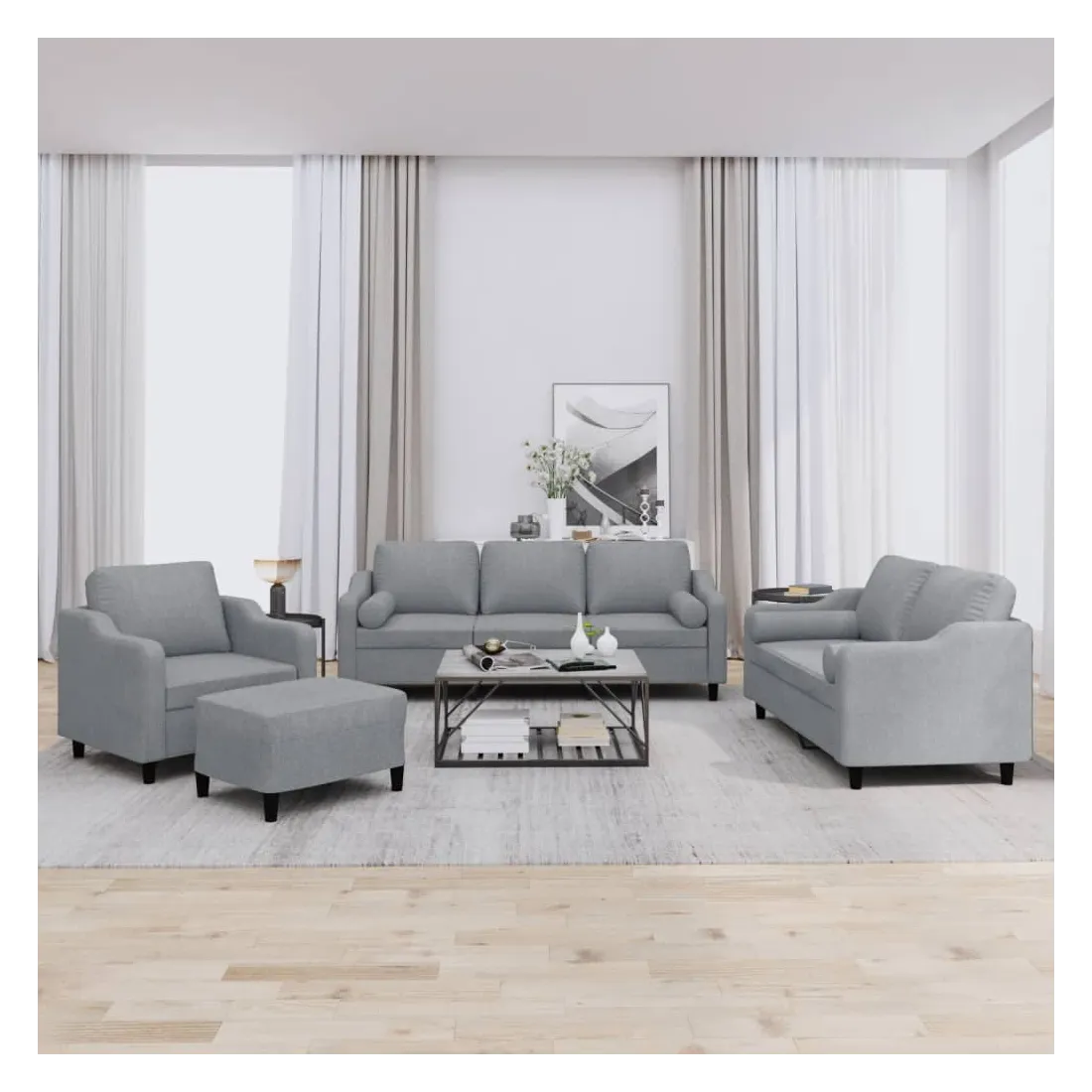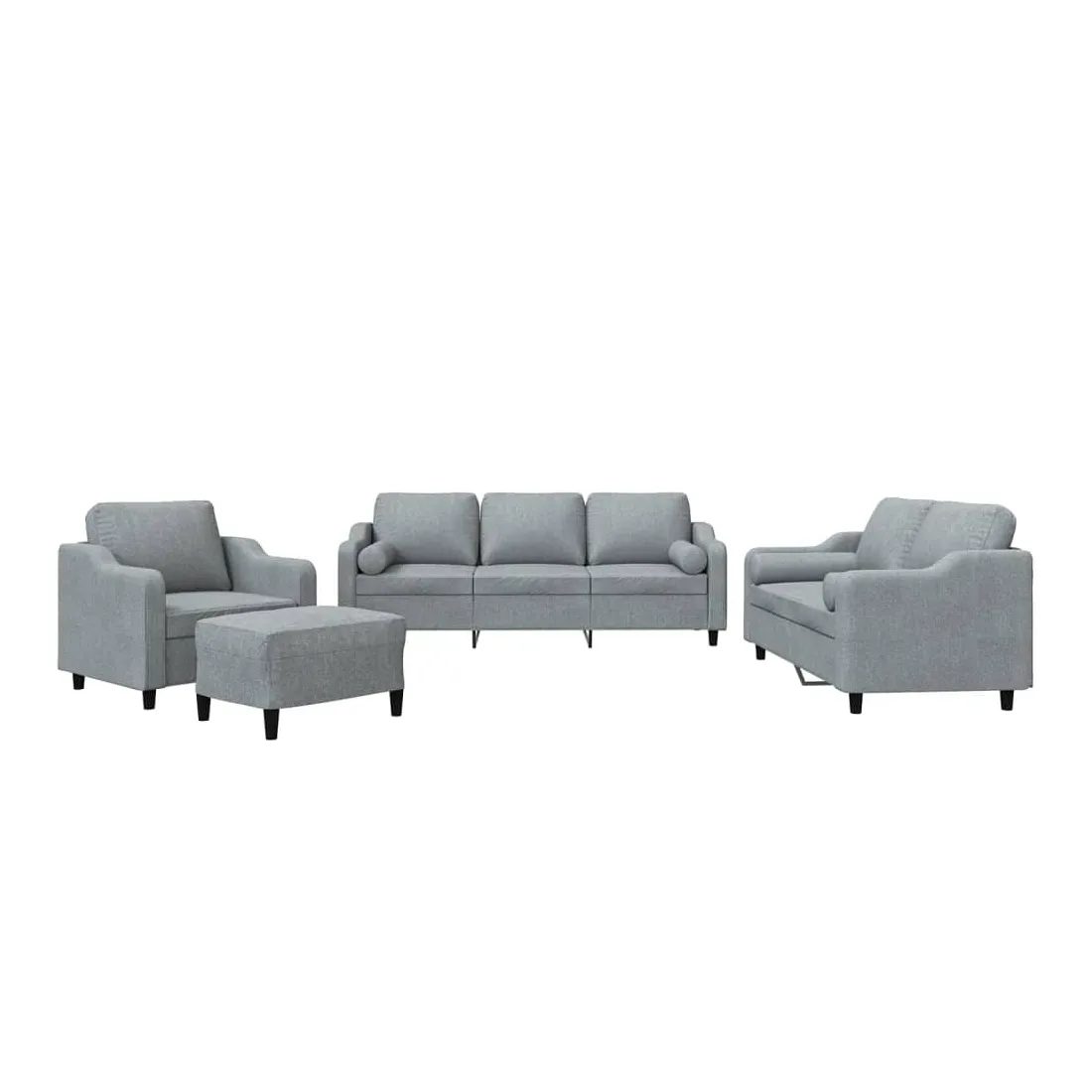 Cet ensemble de canapés est un excellent endroit pour discuter, lire, regarder la télévision ou simplement vous détendre. Il est destiné à être un point central de votre maison. Tissu durable : le tissu présente un aspect simple et épuré tout en restant respirant et durable.Structure robuste et stable : la structure en contreplaqué et en métal du canapé assure robustesse et stabilité. Expérience d'assise confortable : le canapé est très confortable avec le siège, les accoudoirs et les oreillers de dossier bien rembourrés. Oreillers cylindriques pratiques : ces oreillers cylindriques non seulement embellissent votre décor mais ils peuvent également apporter un confort supplémentaire lorsque vous êtes assis ou allongé. Pouf polyvalent : ce repose-pied convient pour reposer vos pieds lorsque vous êtes allongé dans un canapé ou pour vous offrir un siège supplémentaire dans votre pièce. De plus, le design simple et la taille compacte le rendent idéal pour presque tous vos espaces de vie.