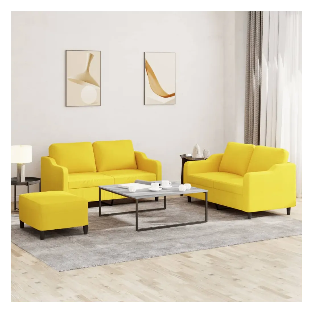 Cet ensemble de canapés est un excellent endroit pour discuter, lire, regarder la télévision ou simplement vous détendre. Il est destiné à être un point central de votre maison. Tissu durable : le tissu présente un aspect simple et épuré tout en restant respirant et durable.Structure robuste et stable : la structure en contreplaqué et en métal du canapé assure robustesse et stabilité. Expérience d'assise confortable : le canapé est très confortable avec le siège, les accoudoirs et les oreillers de dossier bien rembourrés. Pouf polyvalent : ce repose-pied convient pour reposer vos pieds lorsque vous êtes allongé dans un canapé ou pour vous offrir un siège supplémentaire dans votre pièce. De plus, le design simple et la taille compacte le rendent idéal pour presque tous vos espaces de vie.