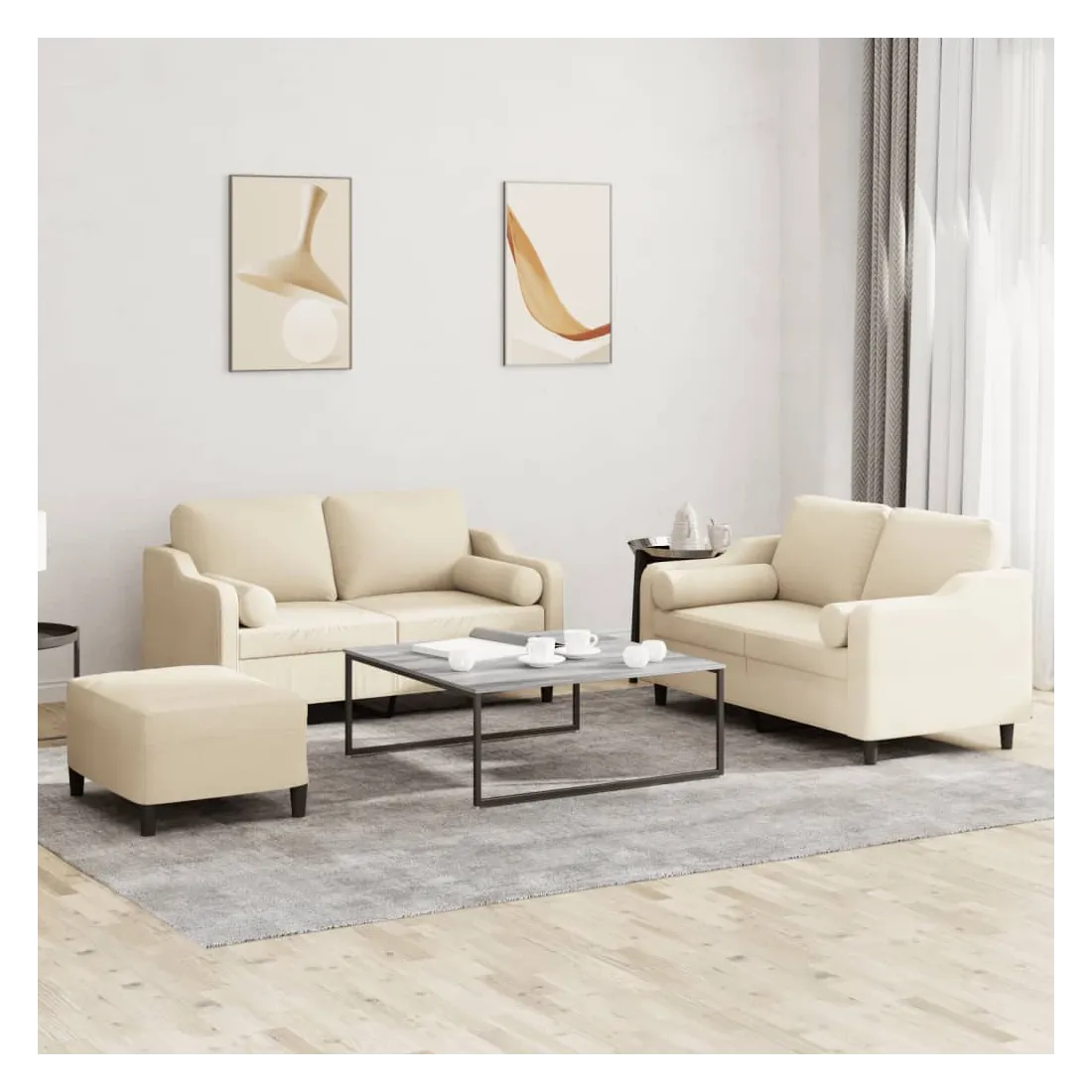 Cet ensemble de canapés est un excellent endroit pour discuter, lire, regarder la télévision ou simplement vous détendre. Il est destiné à être un point central de votre maison. Tissu durable : le tissu présente un aspect simple et épuré tout en restant respirant et durable.Structure robuste et stable : la structure en contreplaqué et en métal du canapé assure robustesse et stabilité. Expérience d'assise confortable : le canapé est très confortable avec le siège, les accoudoirs et les oreillers de dossier bien rembourrés. Oreillers cylindriques pratiques : ces oreillers cylindriques non seulement embellissent votre décor mais ils peuvent également apporter un confort supplémentaire lorsque vous êtes assis ou allongé. Pouf polyvalent : ce repose-pied convient pour reposer vos pieds lorsque vous êtes allongé dans un canapé ou pour vous offrir un siège supplémentaire dans votre pièce. De plus, le design simple et la taille compacte le rendent idéal pour presque tous vos espaces de vie.
