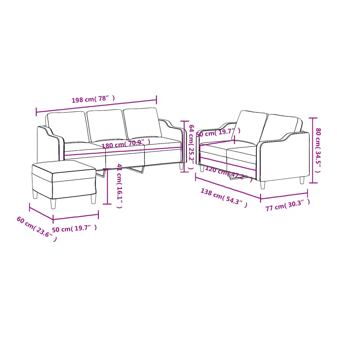 vidaXLCet ensemble de canapés est un excellent endroit pour discuter, lire, regarder la télévision ou simplement vous détendre. Il est destiné à être un point central de votre maison. Tissu durable : le tissu présente un aspect simple et épuré tout en restant respirant et durable.Structure robuste et stable : la structure en contreplaqué et en métal du canapé assure robustesse et stabilité. Expérience d'assise confortable : le canapé est très confortable avec le siège, les accoudoirs et les oreillers de dossier bien rembourrés. Pouf polyvalent : ce repose-pied convient pour reposer vos pieds lorsque vous êtes allongé dans un canapé ou pour vous offrir un siège supplémentaire dans votre pièce. De plus, le design simple et la taille compacte le rendent idéal pour presque tous vos espaces de vie.