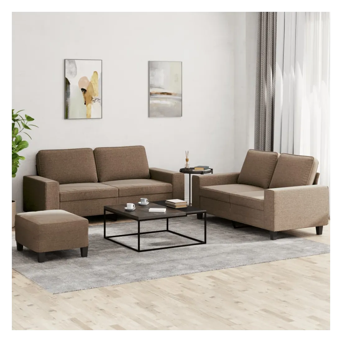 Cet ensemble de canapés est un excellent endroit pour discuter, lire, regarder la télévision ou simplement vous détendre. Il est destiné à être un point central de votre maison. Tissu durable : le tissu présente un aspect simple et épuré tout en restant respirant et durable.Structure robuste et stable : la structure en contreplaqué et en métal du canapé assure robustesse et stabilité.Expérience d'assise confortable : le canapé est très confortable avec le siège, les accoudoirs et les oreillers de dossier bien rembourrés.Pouf polyvalent : ce repose-pied convient pour reposer vos pieds lorsque vous êtes allongé dans un canapé ou pour vous offrir un siège supplémentaire dans votre pièce. De plus, le design simple et la taille compacte le rendent idéal pour presque tous vos espaces de vie.