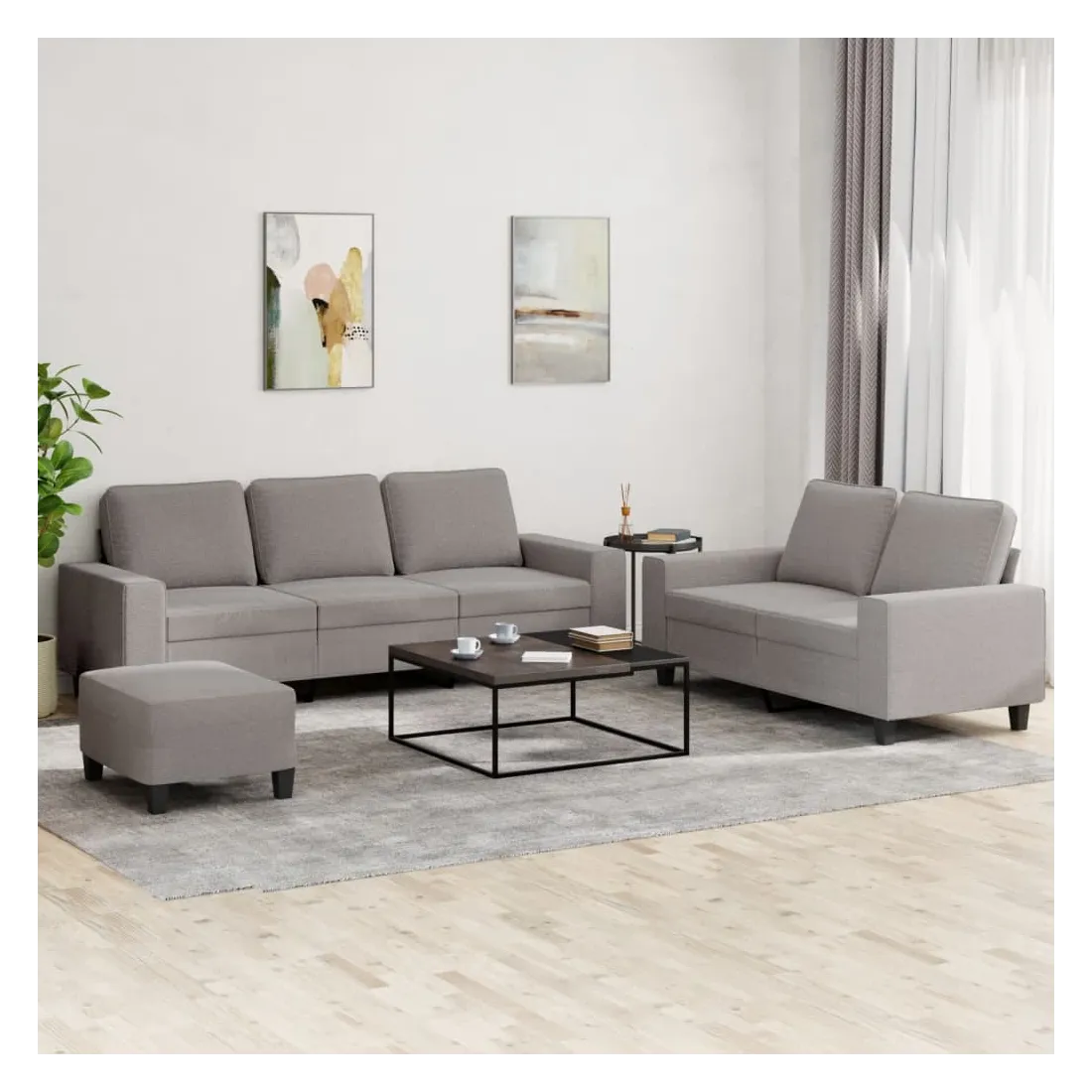 Cet ensemble de canapés est un excellent endroit pour discuter, lire, regarder la télévision ou simplement vous détendre. Il est destiné à être un point central de votre maison. Tissu durable : le tissu présente un aspect simple et épuré tout en restant respirant et durable.Structure robuste et stable : la structure en contreplaqué et en métal du canapé assure robustesse et stabilité.Expérience d'assise confortable : le canapé est très confortable avec le siège, les accoudoirs et les oreillers de dossier bien rembourrés.Pouf polyvalent : ce repose-pied convient pour reposer vos pieds lorsque vous êtes allongé dans un canapé ou pour vous offrir un siège supplémentaire dans votre pièce. De plus, le design simple et la taille compacte le rendent idéal pour presque tous vos espaces de vie.
