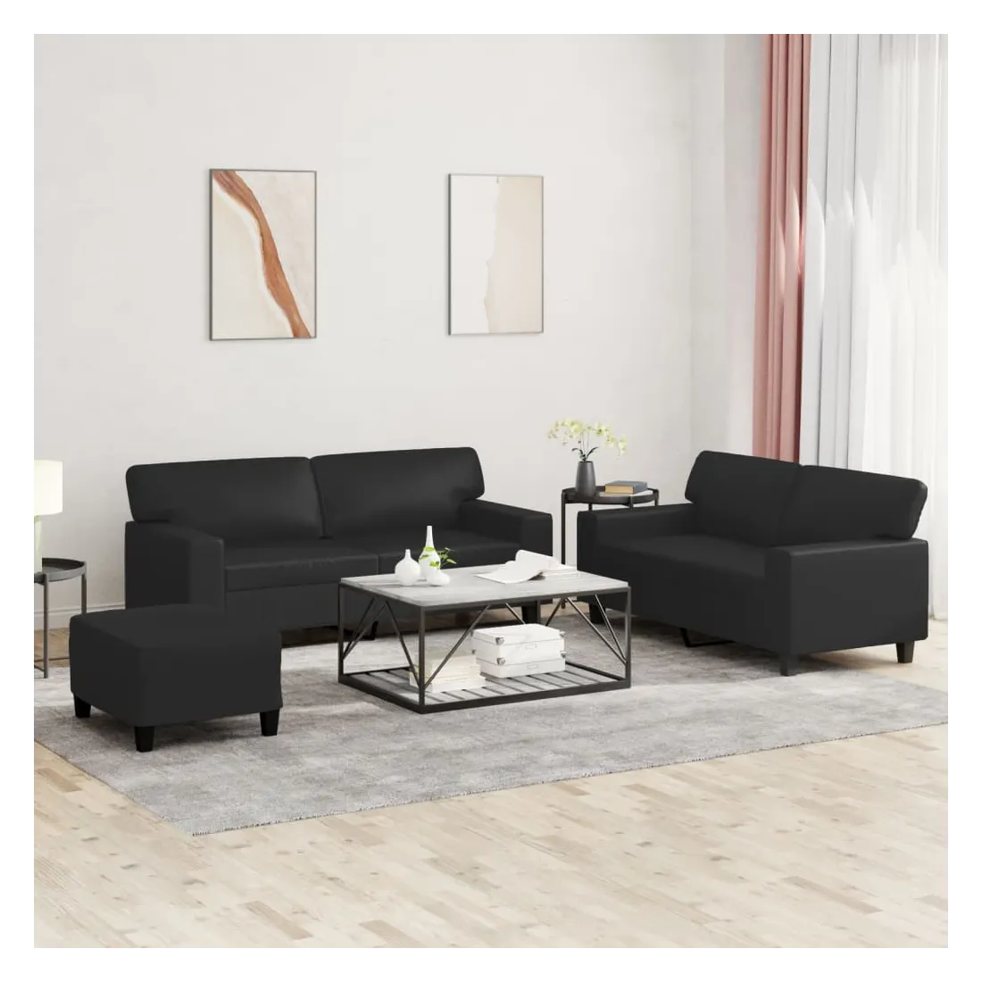 Cet ensemble de canapés est un excellent endroit pour discuter, lire, regarder la télévision ou simplement vous détendre. Il est destiné à être un point central de votre maison. Similicuir durable : le similicuir est un matériau très durable. Il est résistant aux taches, ce qui le rend facile à nettoyer avec un chiffon humide. La surface lisse donne également un aspect luxueux et la beauté du cuir véritable.Structure robuste et stable : la structure en contreplaqué et en métal du canapé assure robustesse et stabilité.Expérience d'assise confortable : le canapé est très confortable avec le siège, les accoudoirs et les oreillers de dossier bien rembourrés.Pouf polyvalent : ce repose-pied convient pour reposer vos pieds lorsque vous êtes allongé dans un canapé ou pour vous offrir un siège supplémentaire dans votre pièce. De plus, le design simple et la taille compacte le rendent idéal pour presque tous vos espaces de vie.