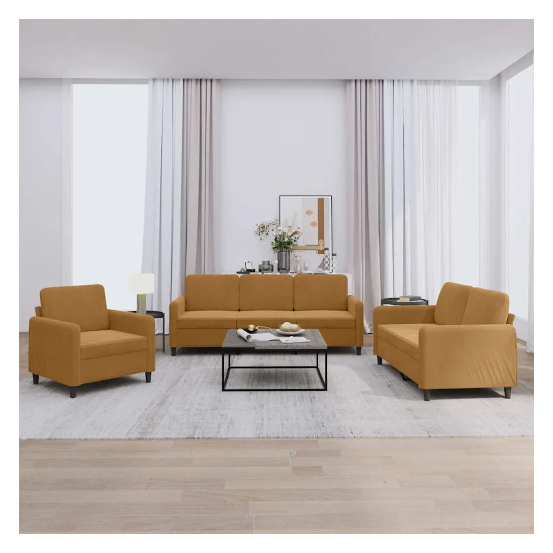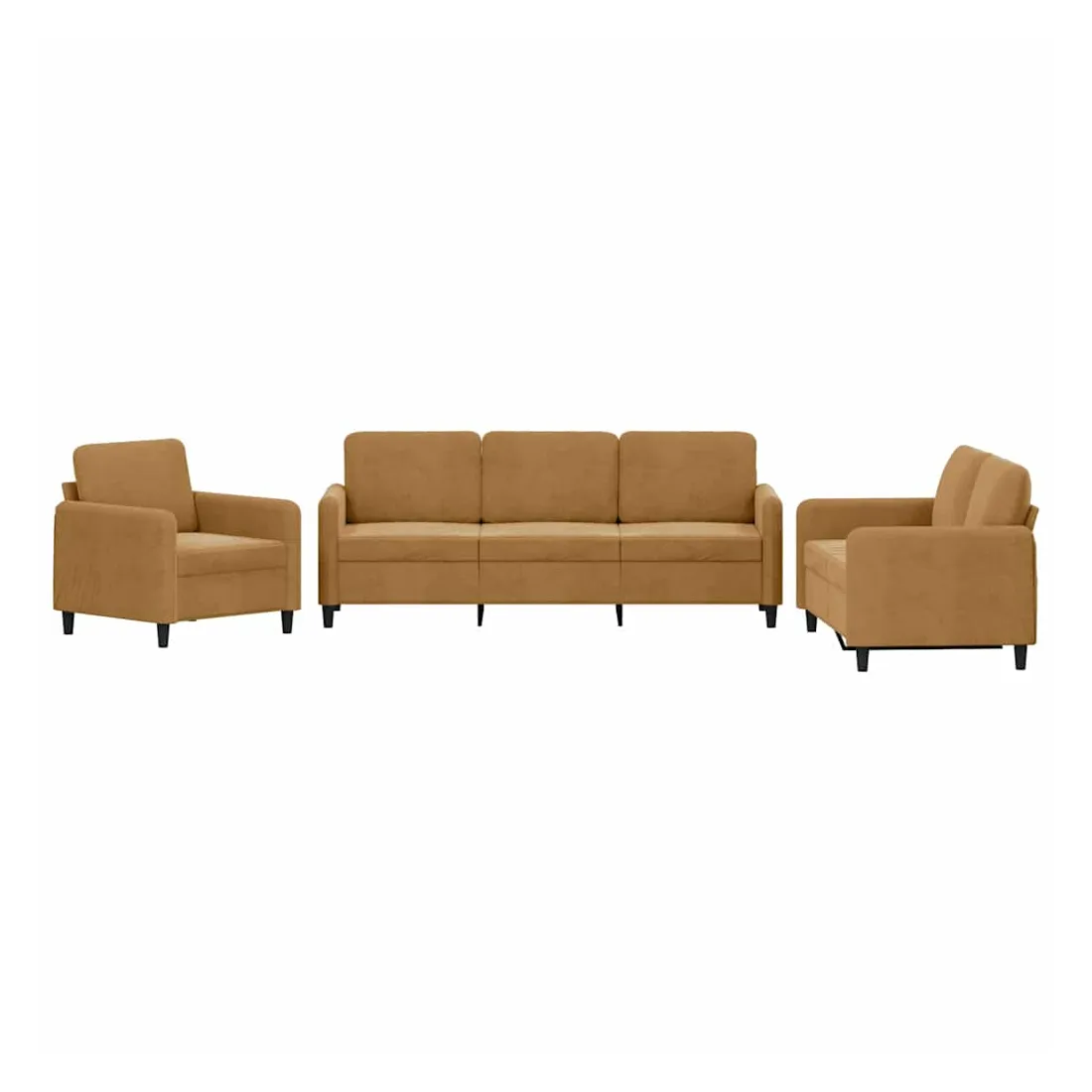 Cet ensemble de canapés est un excellent endroit pour discuter, lire, regarder la télévision ou simplement vous détendre. Il est destiné à être un point central de votre maison. Velours doux : le velours est un tissu doux et confortable, agréable au toucher.Structure robuste et stable : la structure en contreplaqué et en métal du canapé assure robustesse et stabilité.Expérience d'assise confortable : le canapé est très confortable avec le siège, les accoudoirs et les oreillers de dossier bien rembourrés.