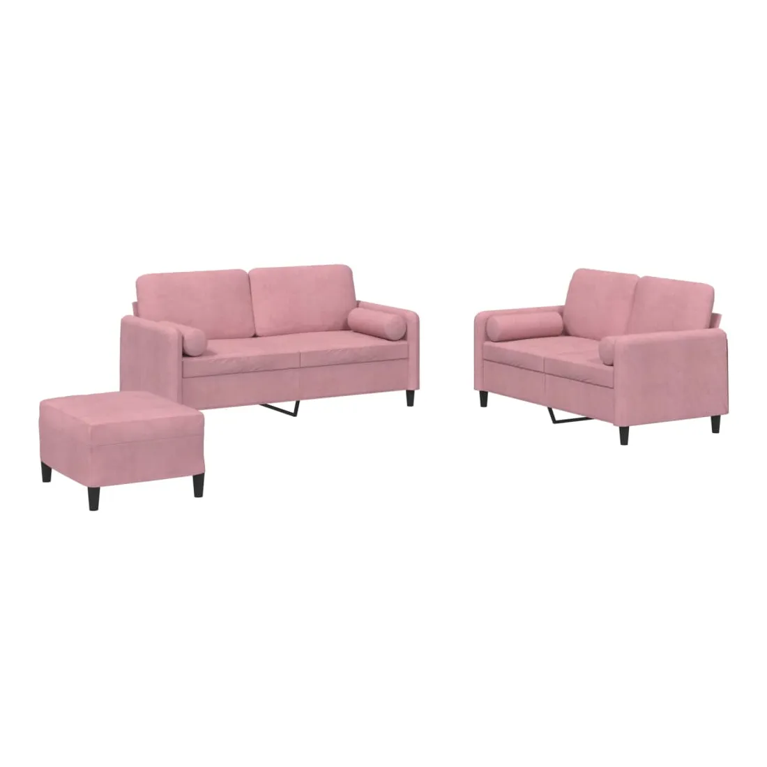 Cet ensemble de canapés est un excellent endroit pour discuter, lire, regarder la télévision ou simplement vous détendre. Il est destiné à être un point central de votre maison. Velours doux : le velours est un tissu doux et confortable, agréable au toucher.Structure robuste et stable : la structure en contreplaqué et en métal du canapé assure robustesse et stabilité.Expérience d'assise confortable : le canapé est très confortable avec le siège, les accoudoirs et les oreillers de dossier bien rembourrés.Oreillers cylindriques pratiques : ces oreillers cylindriques non seulement embellissent votre décor mais ils peuvent également apporter un confort supplémentaire lorsque vous êtes assis ou allongé.Pouf polyvalent : ce repose-pied convient pour reposer vos pieds lorsque vous êtes allongé dans un canapé ou pour vous offrir un siège supplémentaire dans votre pièce. De plus, le design simple et la taille compacte le rendent idéal pour presque tous vos espaces de vie.