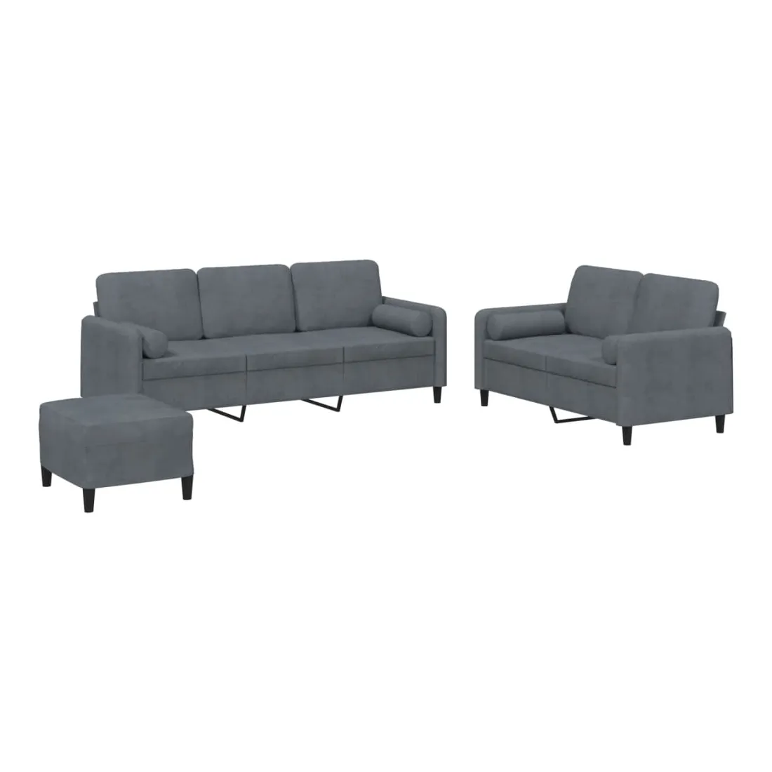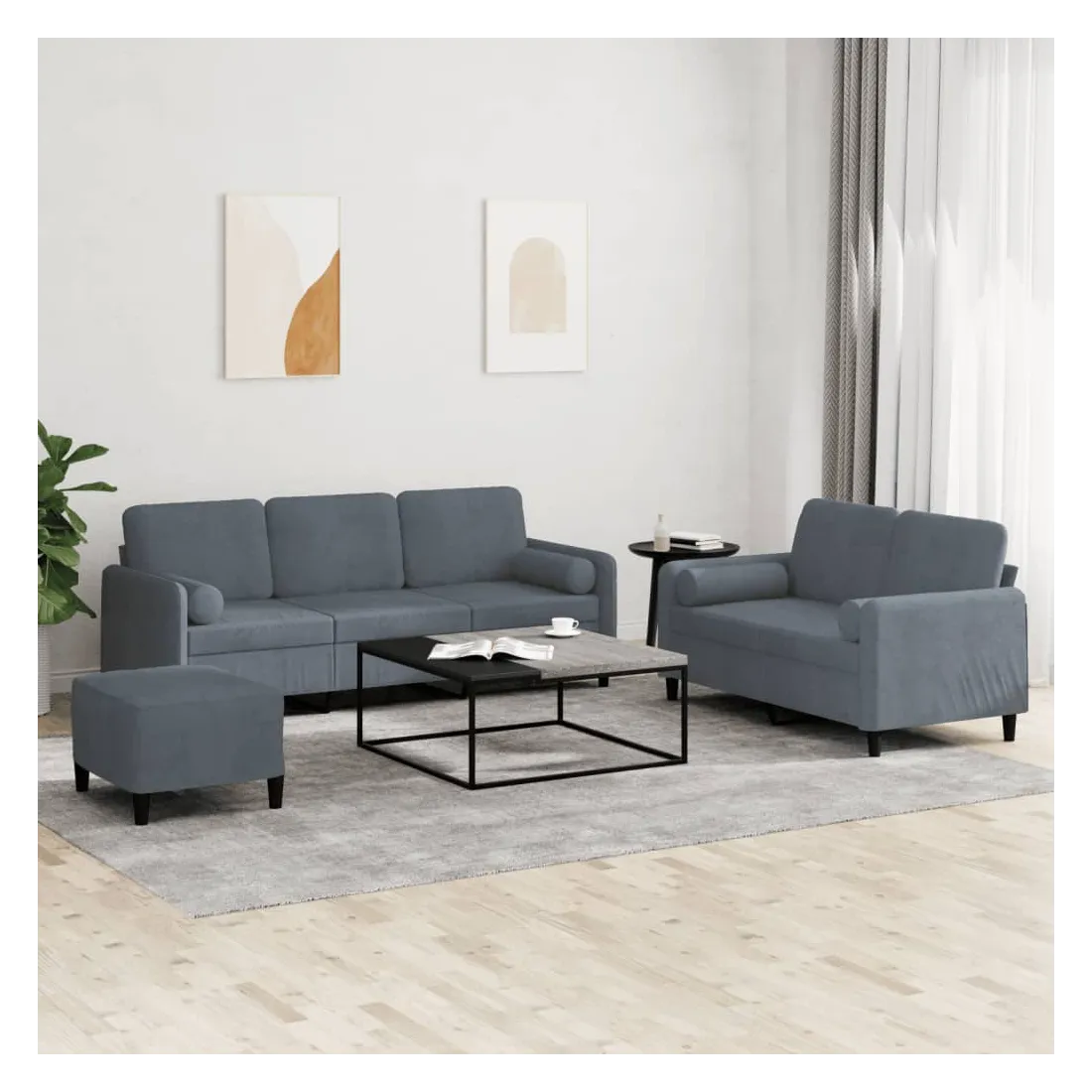 Cet ensemble de canapés est un excellent endroit pour discuter, lire, regarder la télévision ou simplement vous détendre. Il est destiné à être un point central de votre maison. Velours doux : le velours est un tissu doux et confortable, agréable au toucher.Structure robuste et stable : la structure en contreplaqué et en métal du canapé assure robustesse et stabilité.Expérience d'assise confortable : le canapé est très confortable avec le siège, les accoudoirs et les oreillers de dossier bien rembourrés.Oreillers cylindriques pratiques : ces oreillers cylindriques non seulement embellissent votre décor mais ils peuvent également apporter un confort supplémentaire lorsque vous êtes assis ou allongé.Pouf polyvalent : ce repose-pied convient pour reposer vos pieds lorsque vous êtes allongé dans un canapé ou pour vous offrir un siège supplémentaire dans votre pièce. De plus, le design simple et la taille compacte le rendent idéal pour presque tous vos espaces de vie.