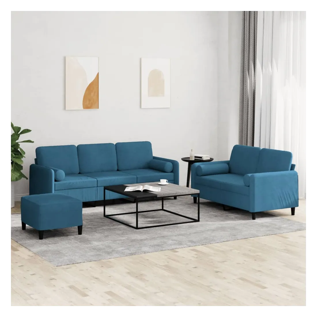 Cet ensemble de canapés est un excellent endroit pour discuter, lire, regarder la télévision ou simplement vous détendre. Il est destiné à être un point central de votre maison. Velours doux : le velours est un tissu doux et confortable, agréable au toucher.Structure robuste et stable : la structure en contreplaqué et en métal du canapé assure robustesse et stabilité.Expérience d'assise confortable : le canapé est très confortable avec le siège, les accoudoirs et les oreillers de dossier bien rembourrés.Oreillers cylindriques pratiques : ces oreillers cylindriques non seulement embellissent votre décor mais ils peuvent également apporter un confort supplémentaire lorsque vous êtes assis ou allongé.Pouf polyvalent : ce repose-pied convient pour reposer vos pieds lorsque vous êtes allongé dans un canapé ou pour vous offrir un siège supplémentaire dans votre pièce. De plus, le design simple et la taille compacte le rendent idéal pour presque tous vos espaces de vie.