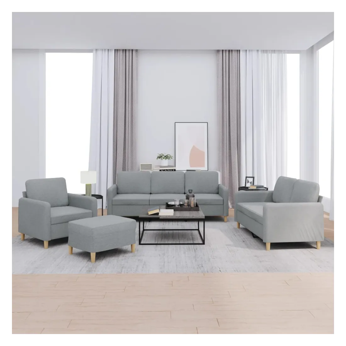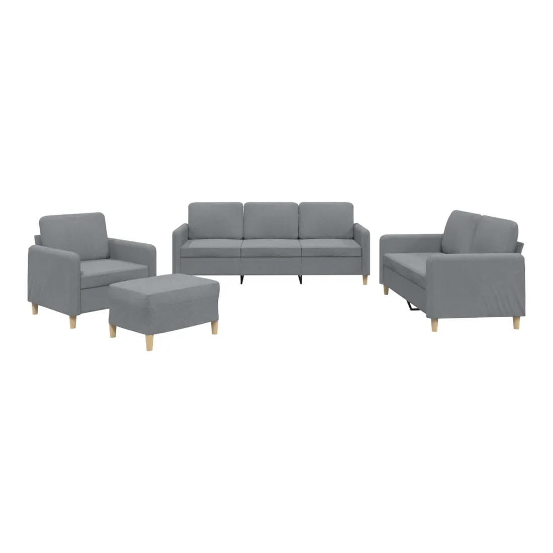 Cet ensemble de canapés est un excellent endroit pour discuter, lire, regarder la télévision ou simplement vous détendre. Il est destiné à être un point central de votre maison. Tissu durable : le tissu présente un aspect simple et épuré tout en restant respirant et durable.Structure robuste et stable : la structure en contreplaqué et en métal du canapé assure robustesse et stabilité.Expérience d'assise confortable : le canapé est très confortable avec le siège, les accoudoirs et les coussins de dossier bien rembourrés.Pouf polyvalent : ce repose-pied convient pour reposer vos pieds lorsque vous êtes allongé dans un canapé ou pour vous offrir un siège supplémentaire dans votre pièce. De plus, le design simple et la taille compacte le rendent idéal pour presque tous vos espaces de vie.