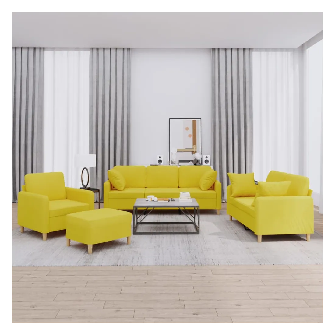Cet ensemble de canapés est un excellent endroit pour discuter, lire, regarder la télévision ou simplement vous détendre. Il est destiné à être un point central de votre maison. Tissu durable : le tissu présente un aspect simple et épuré tout en restant respirant et durable.Structure robuste et stable : la structure en contreplaqué et en métal du canapé assure robustesse et stabilité.Expérience d'assise confortable : le canapé est très confortable avec le siège, les accoudoirs et les coussins de dossier bien rembourrés.Oreillers de canapé pratiques : ces oreillers décoratifs carrés non seulement embellissent votre décor mais ils peuvent également apporter un confort supplémentaire lorsque vous êtes assis ou allongé.Pouf polyvalent : ce repose-pied convient pour reposer vos pieds lorsque vous êtes allongé dans un canapé ou pour vous offrir un siège supplémentaire dans votre pièce. De plus, le design simple et la taille compacte le rendent idéal pour presque tous vos espaces de vie.