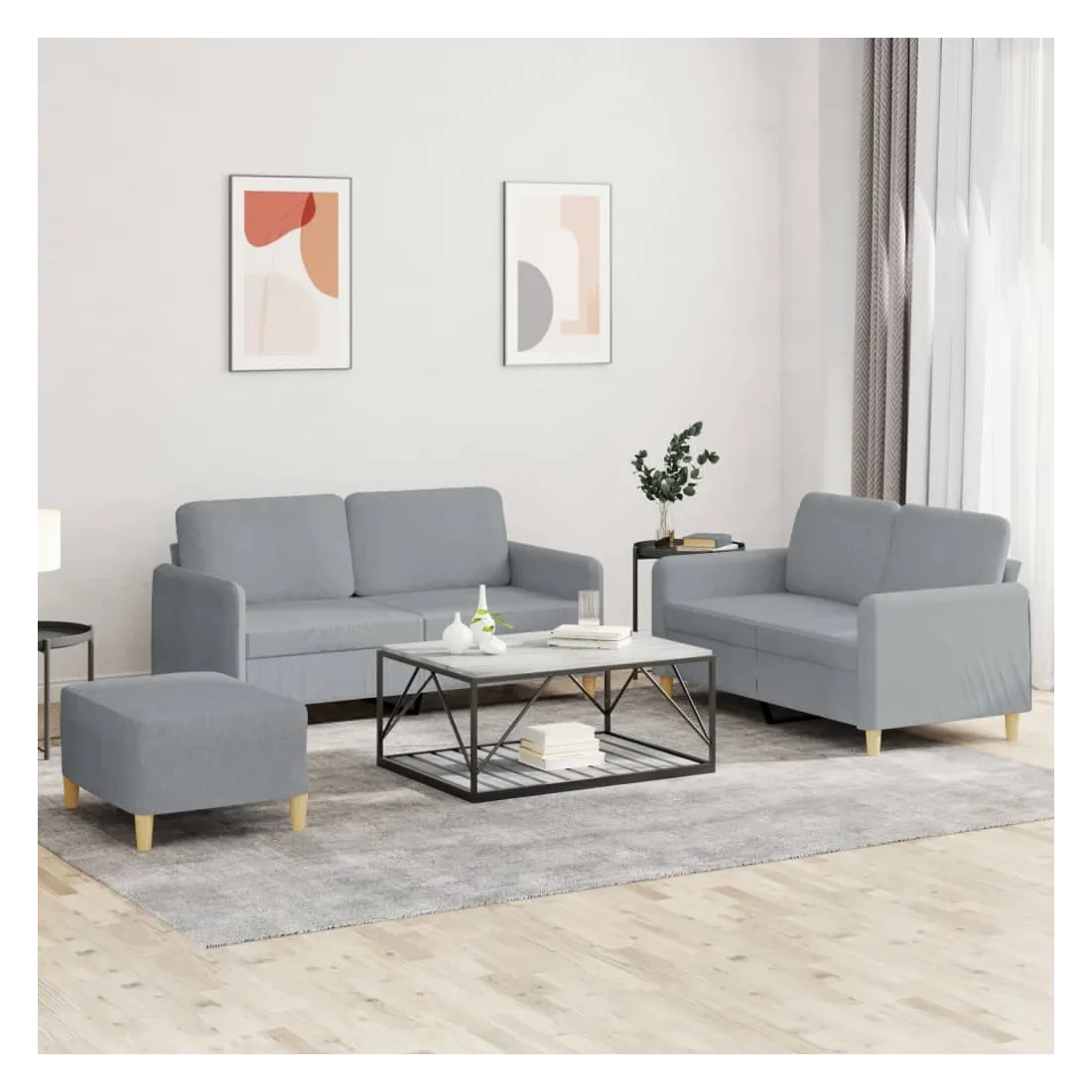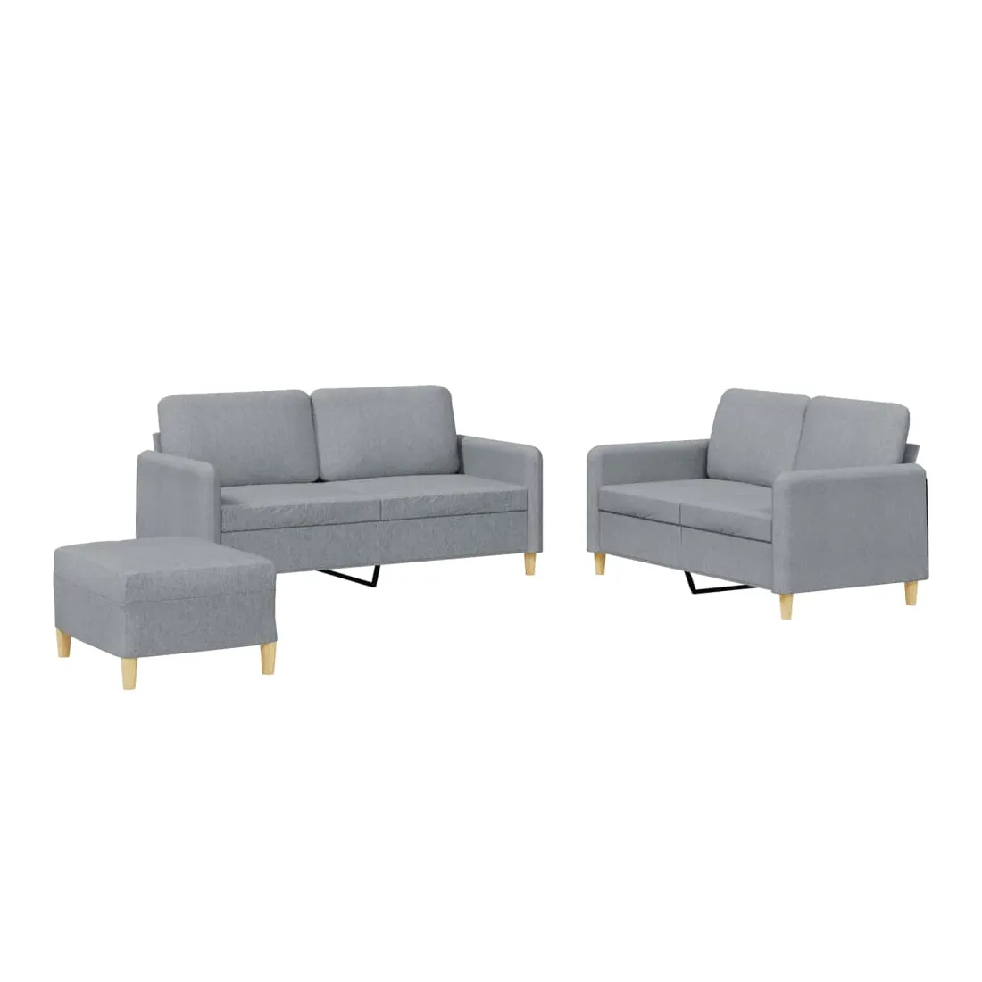 Cet ensemble de canapés est un excellent endroit pour discuter, lire, regarder la télévision ou simplement vous détendre. Il est destiné à être un point central de votre maison. Tissu durable : le tissu présente un aspect simple et épuré tout en restant respirant et durable.Structure robuste et stable : la structure en contreplaqué et en métal du canapé assure robustesse et stabilité.Expérience d'assise confortable : le canapé est très confortable avec le siège, les accoudoirs et les coussins de dossier bien rembourrés.Pouf polyvalent : ce repose-pied convient pour reposer vos pieds lorsque vous êtes allongé dans un canapé ou pour vous offrir un siège supplémentaire dans votre pièce. De plus, le design simple et la taille compacte le rendent idéal pour presque tous vos espaces de vie.