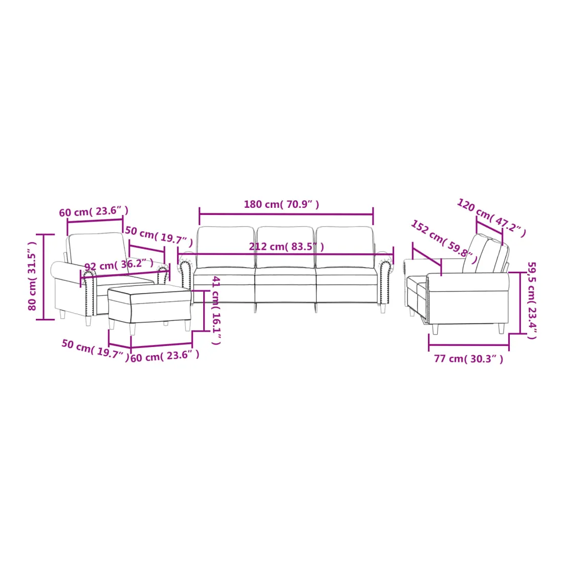 - Dimensions totales : 212 x 77 x 80 cm (l x P x H)