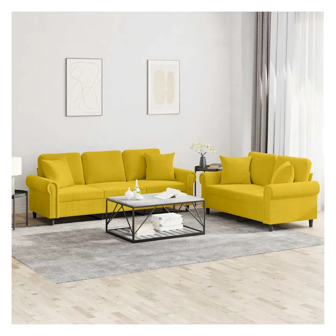 Cet ensemble de canapés est un excellent endroit pour discuter, lire, regarder la télévision ou simplement vous détendre. Il est destiné à être un point central de votre maison. Velours doux : le velours est un tissu doux et confortable, agréable au toucher.Structure robuste et stable : la structure en contreplaqué et en métal du canapé assure robustesse et stabilité.Expérience d'assise confortable : le canapé est très confortable avec le siège, les accoudoirs et les oreillers de dossier bien rembourrés.Oreillers de canapé pratiques : ces oreillers décoratifs carrés non seulement embellissent votre décor mais ils peuvent également apporter un confort supplémentaire lorsque vous êtes assis ou allongé.