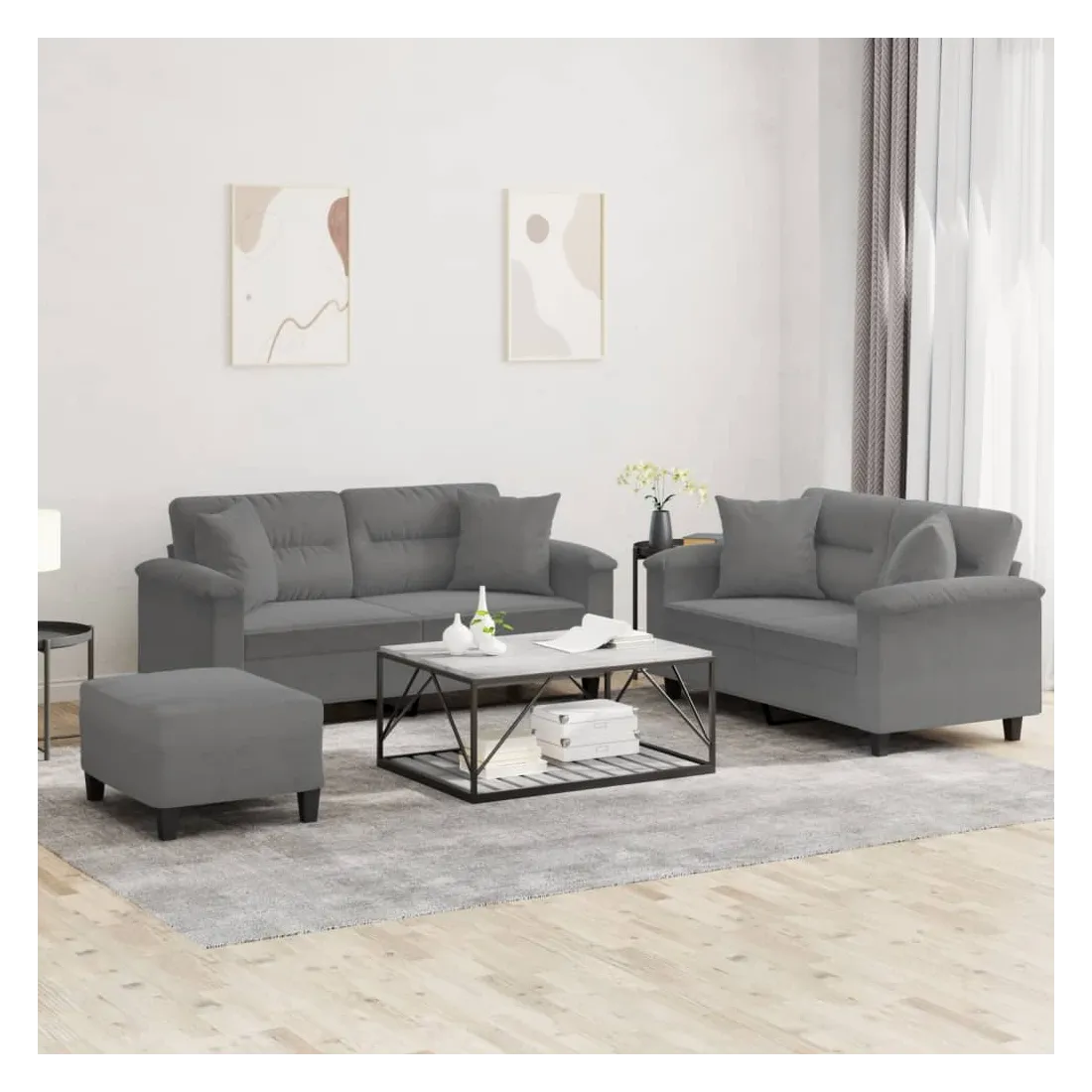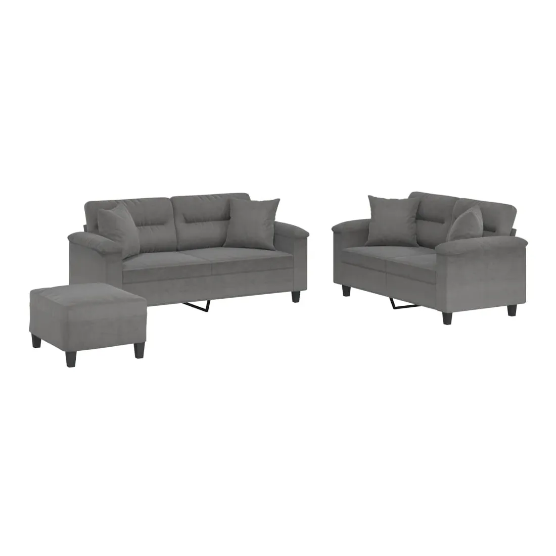 Cet ensemble de canapés est un excellent endroit pour discuter, lire, regarder la télévision ou simplement vous détendre. Il est destiné à être un point central de votre maison. Microfibre résistant : le microfibre est un tissu synthétique composé de fibres ultra-fines, particulièrement résistantes aux taches. Le tissu en microfibre est un excellent choix pour le rembourrage des meubles en raison de sa durabilité et de son nettoyage facile.Structure robuste et stable : la structure en contreplaqué et en métal du canapé assure robustesse et stabilité.Expérience d'assise confortable : le canapé est très confortable avec le siège, les accoudoirs et les oreillers de dossier bien rembourrés.Oreillers de canapé pratiques : ces oreillers décoratifs carrés non seulement embellissent votre décor mais ils peuvent également apporter un confort supplémentaire lorsque vous êtes assis ou allongé.Pouf polyvalent : ce repose-pied convient pour reposer vos pieds lorsque vous êtes allongé dans un canapé, ou pour vous offrir un siège supplémentaire dans votre pièce. De plus, le design simple et la taille compacte le rendent idéal pour presque tous vos espaces de vie.