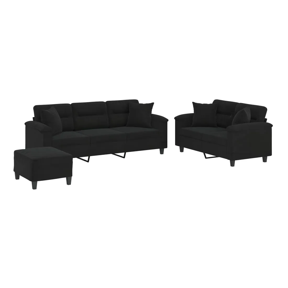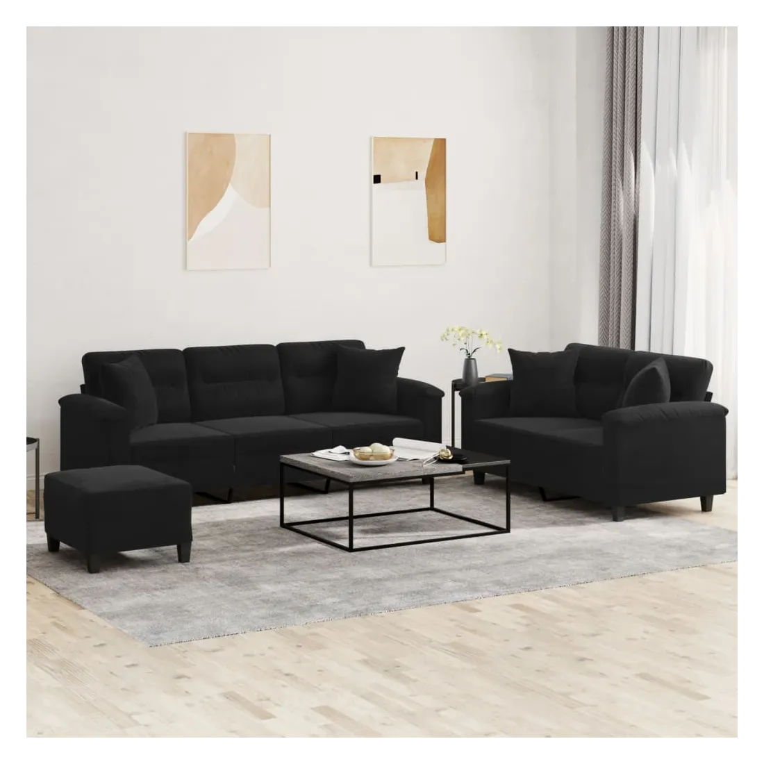 Cet ensemble de canapés est un excellent endroit pour discuter, lire, regarder la télévision ou simplement vous détendre. Il est destiné à être un point central de votre maison. Microfibre résistant : le microfibre est un tissu synthétique composé de fibres ultra-fines, particulièrement résistantes aux taches. Le tissu en microfibre est un excellent choix pour le rembourrage des meubles en raison de sa durabilité et de son nettoyage facile.Structure robuste et stable : la structure en contreplaqué et en métal du canapé assure robustesse et stabilité.Expérience d'assise confortable : le canapé est très confortable avec le siège, les accoudoirs et les oreillers de dossier bien rembourrés.Oreillers de canapé pratiques : ces oreillers décoratifs carrés non seulement embellissent votre décor mais ils peuvent également apporter un confort supplémentaire lorsque vous êtes assis ou allongé.Pouf polyvalent : ce repose-pied convient pour reposer vos pieds lorsque vous êtes allongé dans un canapé, ou pour vous offrir un siège supplémentaire dans votre pièce. De plus, le design simple et la taille compacte le rendent idéal pour presque tous vos espaces de vie.