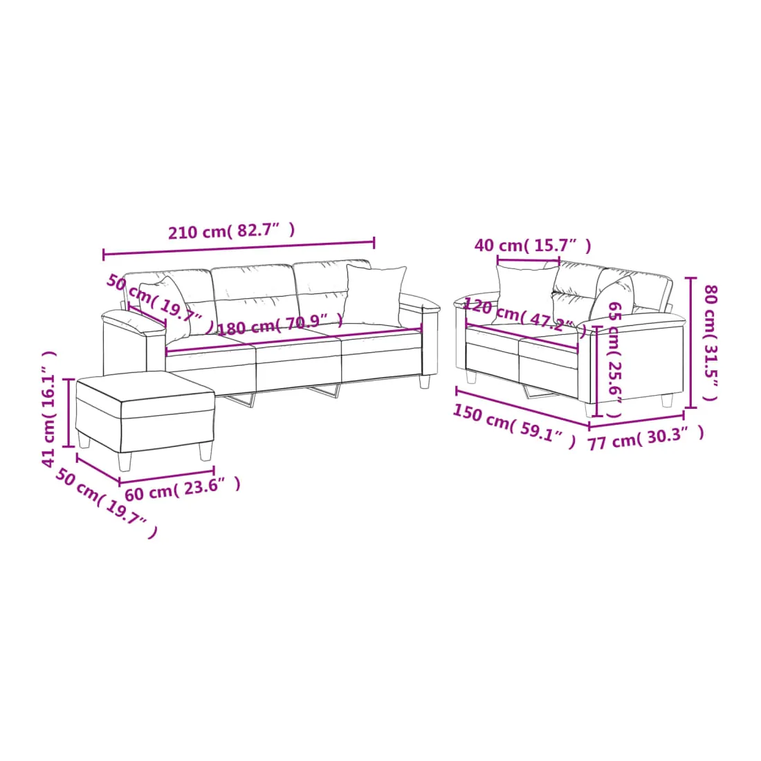vidaXLCet ensemble de canapés est un excellent endroit pour discuter, lire, regarder la télévision ou simplement vous détendre. Il est destiné à être un point central de votre maison. Microfibre résistant : le microfibre est un tissu synthétique composé de fibres ultra-fines, particulièrement résistantes aux taches. Le tissu en microfibre est un excellent choix pour le rembourrage des meubles en raison de sa durabilité et de son nettoyage facile.Structure robuste et stable : la structure en contreplaqué et en métal du canapé assure robustesse et stabilité.Expérience d'assise confortable : le canapé est très confortable avec le siège, les accoudoirs et les oreillers de dossier bien rembourrés.Oreillers de canapé pratiques : ces oreillers décoratifs carrés non seulement embellissent votre décor mais ils peuvent également apporter un confort supplémentaire lorsque vous êtes assis ou allongé.Pouf polyvalent : ce repose-pied convient pour reposer vos pieds lorsque vous êtes allongé dans un canapé, ou pour vous offrir un siège supplémentaire dans votre pièce. De plus, le design simple et la taille compacte le rendent idéal pour presque tous vos espaces de vie.