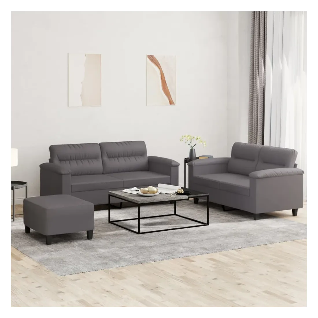 Cet ensemble de canapés est un excellent endroit pour discuter, lire, regarder la télévision ou simplement vous détendre. Il est destiné à être un point central de votre maison. Similicuir durable : le similicuir est un matériau très durable. Il est résistant aux taches, ce qui le rend facile à nettoyer avec un chiffon humide. La surface lisse donne également un aspect luxueux et la beauté du cuir véritable.Structure robuste et stable : la structure en contreplaqué et en métal du canapé assure robustesse et stabilité.Expérience d'assise confortable : le canapé est très confortable avec le siège, les accoudoirs et les oreillers de dossier bien rembourrés.Pouf polyvalent : ce repose-pied convient pour reposer vos pieds lorsque vous êtes allongé dans un canapé, ou pour vous offrir un siège supplémentaire dans votre pièce. De plus, le design simple et la taille compacte le rendent idéal pour presque tous vos espaces de vie.