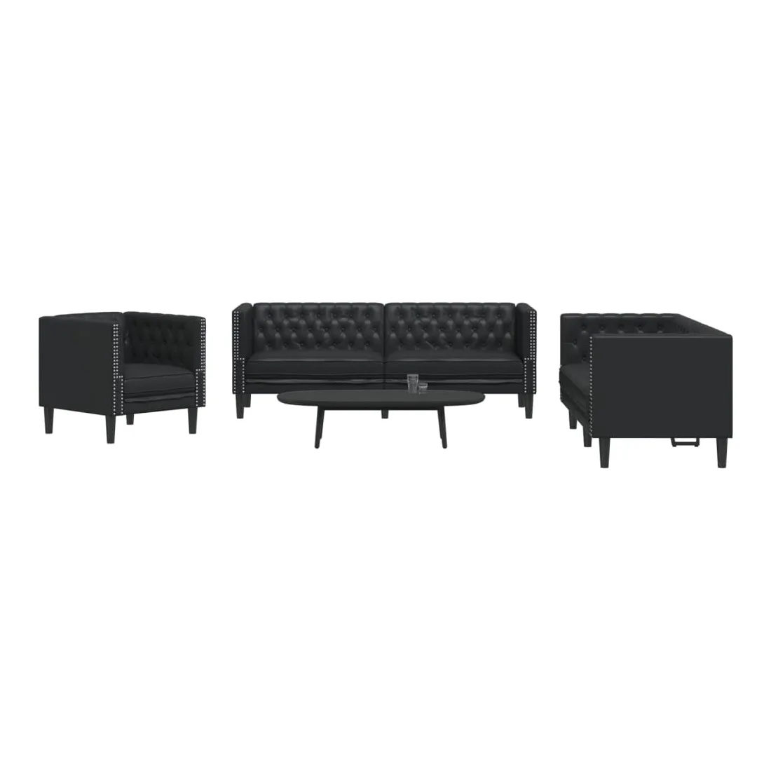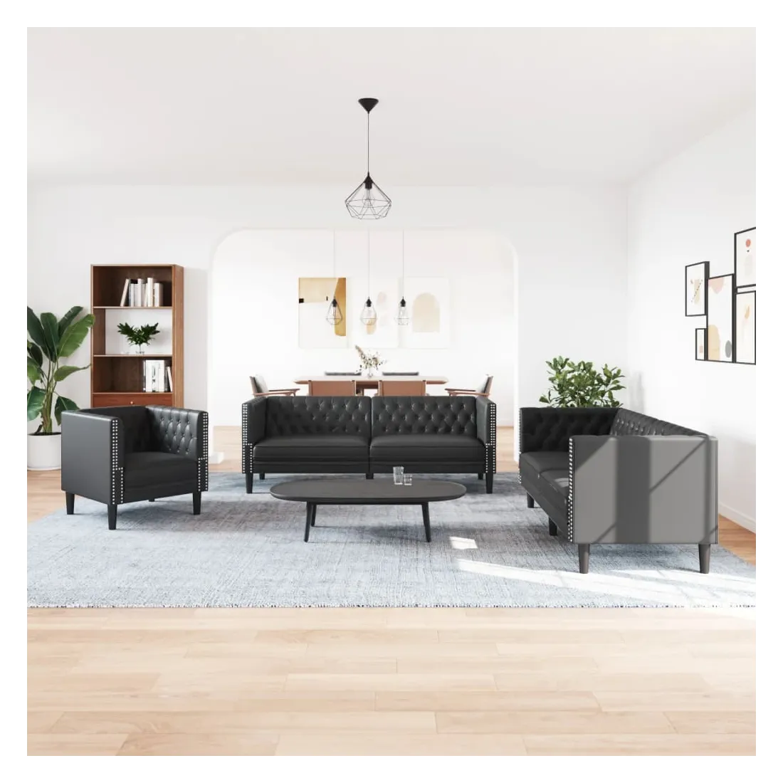 Cet ensemble de canapé Chesterfield est un excellent endroit pour discuter, lire, regarder la télévision ou simplement se détendre. Il est destiné à être un point central dans votre maison. Longue durée de vie et entretien facile : le similicuir est un matériau très durable qui résiste aux taches, ce qui le rend facile à nettoyer avec un chiffon humide. Sa surface lisse lui confère un aspect élégant qui ressemble à celui du cuir véritable.Expérience d'assise confortable : le canapé est très confortable avec les sièges, les accoudoirs et les oreillers de dossier bien rembourrés.Style Chesterfield : avec le dossier et les accoudoirs classiques à boutons tuftés, et une hauteur de dossier et d'accoudoir uniforme, le canapé rehaussera n'importe quelle pièce, offrant à la fois style et confort.Pieds de soutien : le canapé rembourré est soutenu par des pieds robustes, qui assurent sa stabilité, sa sécurité et sa fermeté.