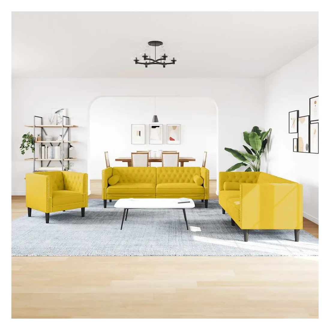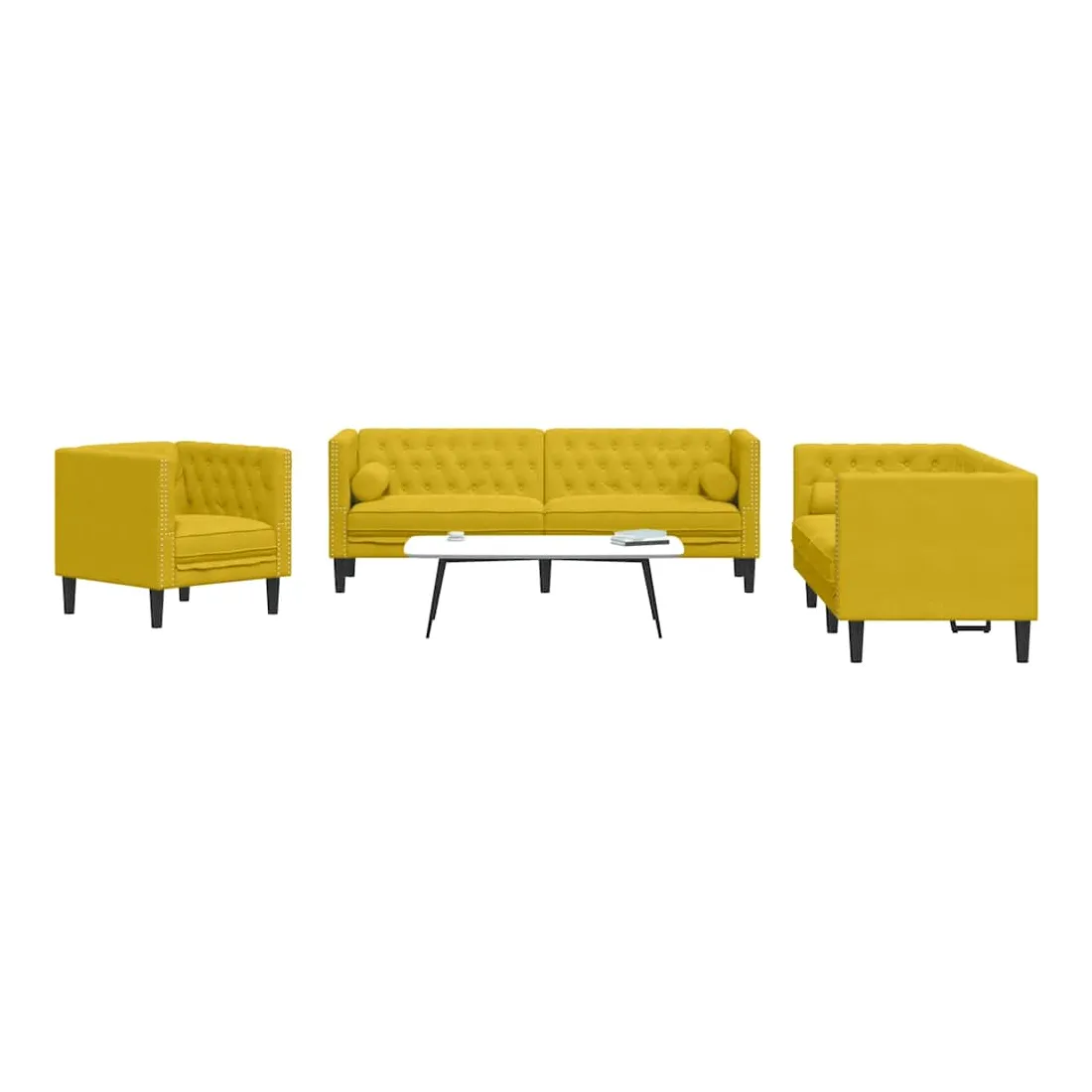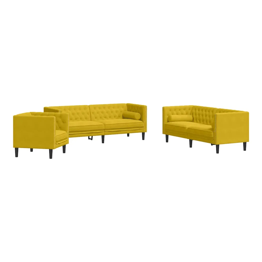 Cet ensemble de canapé Chesterfield est un excellent endroit pour discuter, lire, regarder la télévision ou simplement se détendre. Il est destiné à être un point central dans votre maison. Matériau doux et confortable : le tissu en velours présente une surface douce et lisse qui offre une sensation agréable contre la peau, vous apportant chaleur et confort ultime.Expérience d'assise confortable : le canapé est très confortable avec les sièges, les accoudoirs et les oreillers de dossier bien rembourrés. Les traversins inclus ne font pas qu'embellir votre décor, ils peuvent aussi ajouter un confort supplémentaire lorsque vous êtes assis ou allongé.Style Chesterfield : avec le dossier et les accoudoirs classiques à boutons tuftés, et une hauteur de dossier et d'accoudoir uniforme, le canapé rehaussera n'importe quelle pièce, offrant à la fois style et confort.Pieds de soutien : le canapé rembourré est soutenu par des pieds robustes, qui assurent sa stabilité, sa sécurité et sa fermeté.