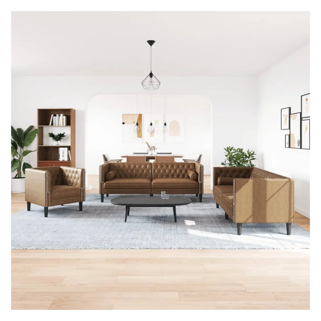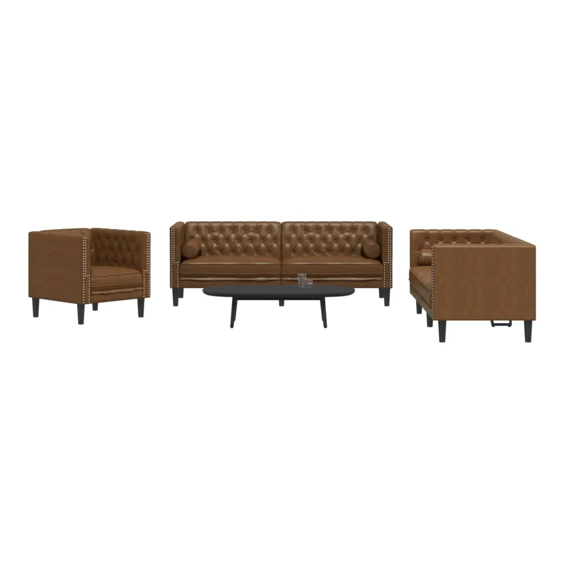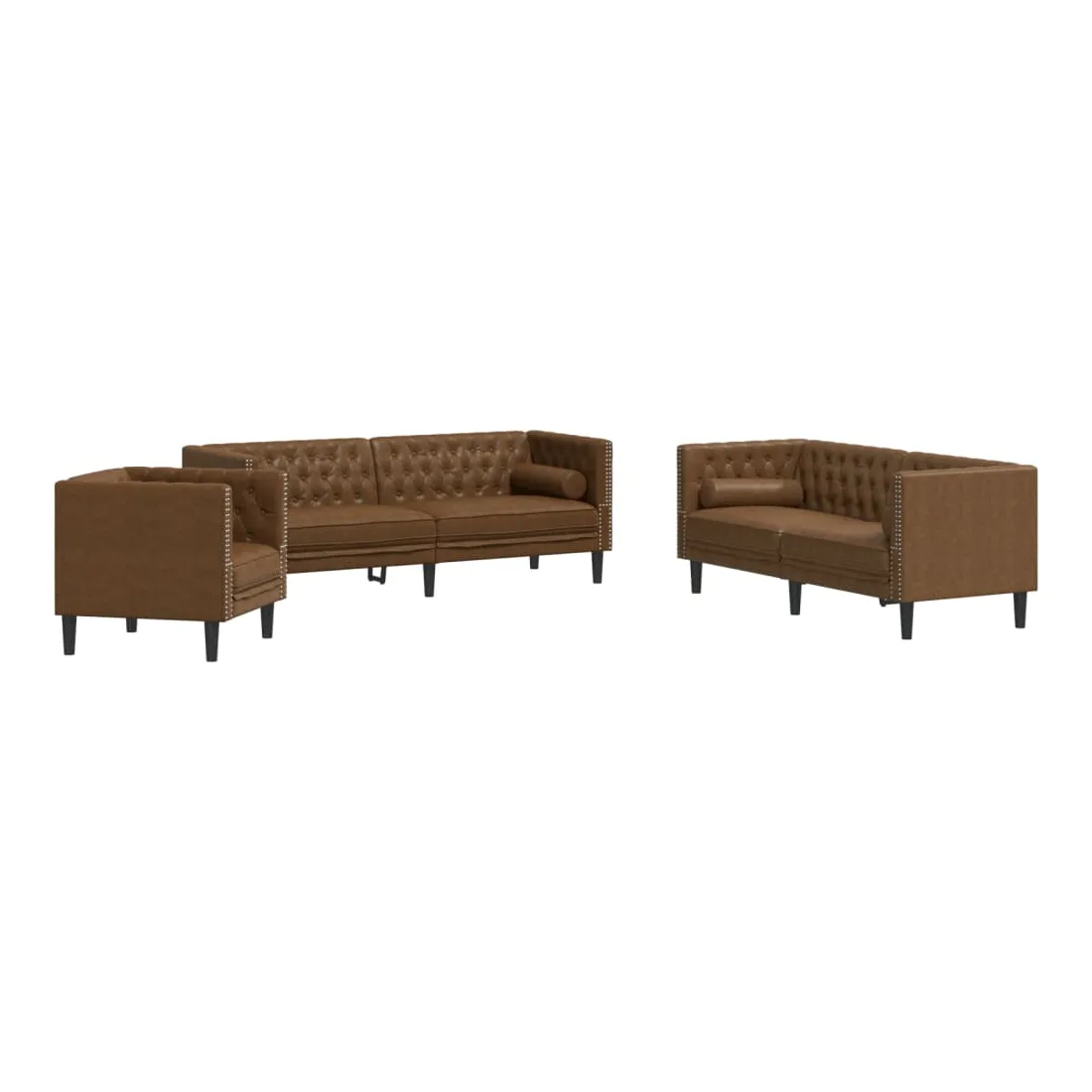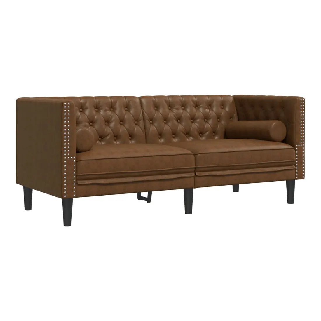 Cet ensemble de canapé Chesterfield est un excellent endroit pour discuter, lire, regarder la télévision ou simplement se détendre. Il est destiné à être un point central dans votre maison. Doux et durable : le similicuir daim est composé de fibres ultra-fines, particulièrement résistantes aux taches. Le similicuir daim est un excellent choix pour le rembourrage des meubles en raison de sa durabilité et de son nettoyage facile.Expérience d'assise confortable : le canapé est très confortable avec les sièges, les accoudoirs et les oreillers de dossier bien rembourrés. Les traversins inclus ne font pas qu'embellir votre décor, ils peuvent aussi ajouter un confort supplémentaire lorsque vous êtes assis ou allongé.Style Chesterfield : avec le dossier et les accoudoirs classiques à boutons tuftés, et une hauteur de dossier et d'accoudoir uniforme, le canapé rehaussera n'importe quelle pièce, offrant à la fois style et confort.Pieds de soutien : le canapé rembourré est soutenu par des pieds robustes, qui assurent sa stabilité, sa sécurité et sa fermeté.